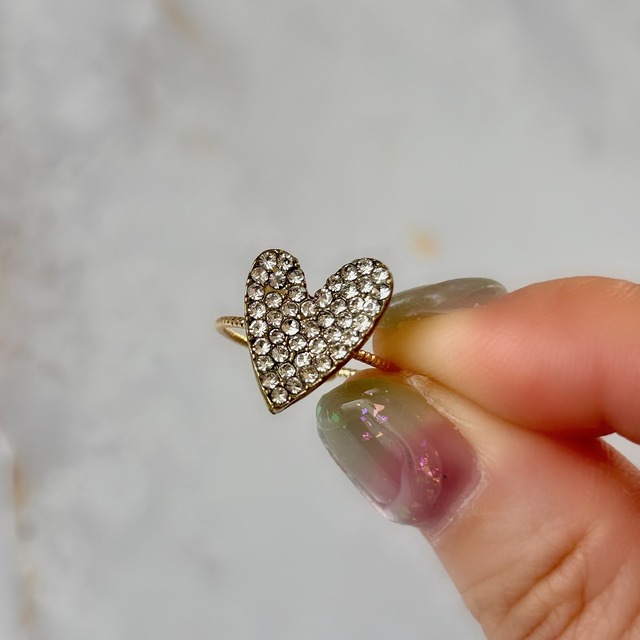 juemee<Chic heart-ring> juemee ハートシリーズ♡ シックなハートが大人の可愛さを演出してくれるリング♡ キラキラとしたラインストーンに落ち着いたゴールドのハートフレームが大人心を擽ります どんなシチュエーションにも着けやすい小粒デザインです! リングは9号・11号からお選びいただけます (各サイズで調整可能のフリーサイズです) 商品オプションよりサイズをご選択ください ※選択がない場合は9号サイズでご注文が入ります オールシーズン大活躍アクセサリー間違いなしのリングです♡ お揃いで着けられるピアス╱イヤリングが別ページにて販売中です リング詳細 ・サイズ 最小9号・最小11号(調整可能のフリーサイズ) ※こちらはアレルギー非対応です ※接着面をコーティングするのにレジンを使用しています。レジンアレルギーの方はお気をつけ下さいませ。 ✲ 必ず<SHOPPING GUIDE>を読んでからご購入をお願い致します。 ✲ ご購入から発送まで4、5日頂いてます。 ✲ 送料一律『クリックポスト』200円。選択肢で『ネコポス』350円もお選び頂けます。5000円以上のお買物で送料無料です。 ✲ピアスはサージカルステンレス316Lを使用してます。ポスト部分のみとなっております。 ✲ ハンドメイドなので1つ1つ風合いが違います。ハンドメイドの醍醐味をお楽しみくださいませ。 ✲ あまり強い扱いを重ねると破損する恐れがあります。優しくお取扱くださいませ。 ✲ ゴールド、シルバーはイミテーションです。 ✲ 衛生管理上、不良品以外の返品交換は非対応となっております。ご検討の上ご購入下さい。
