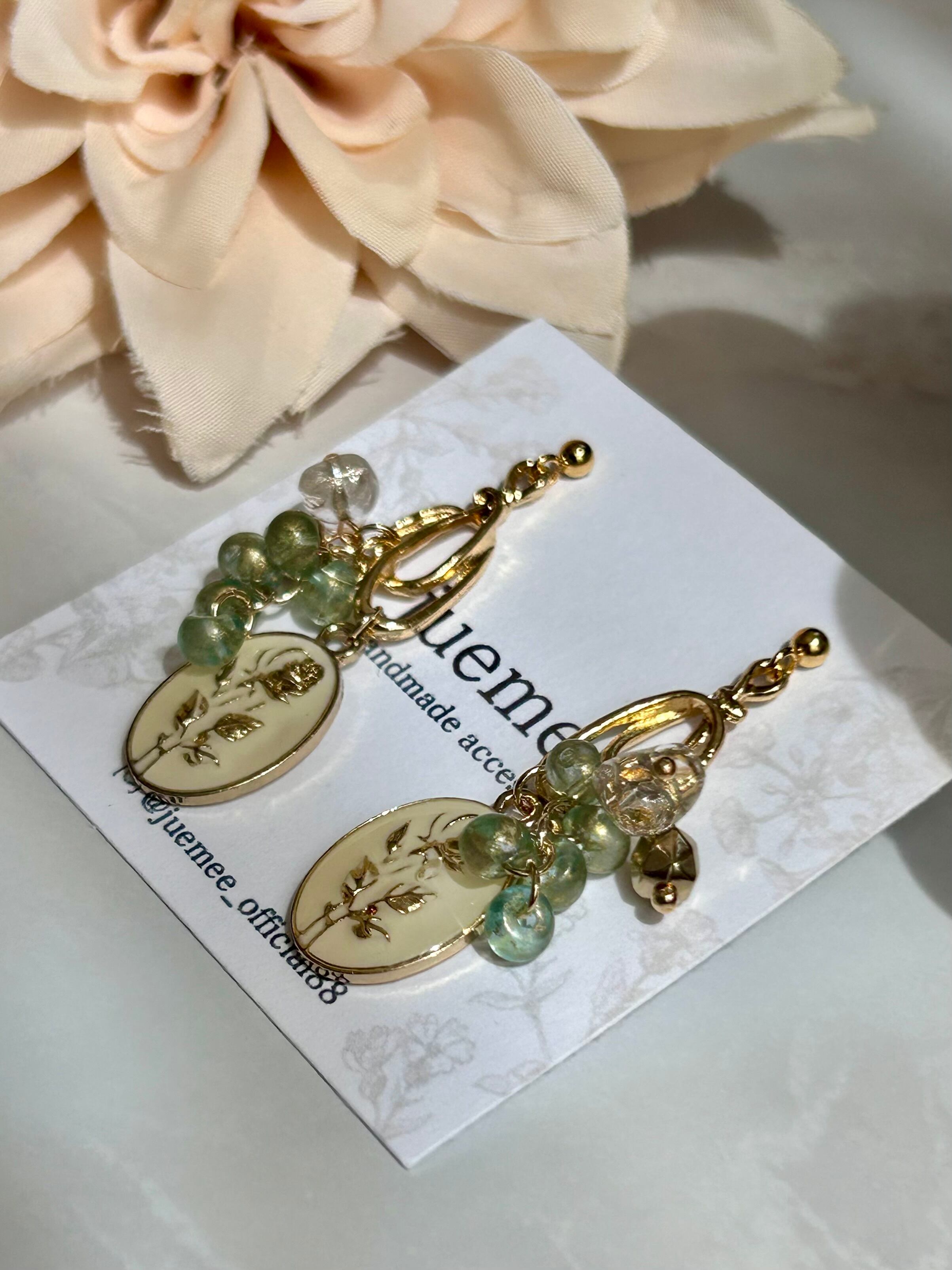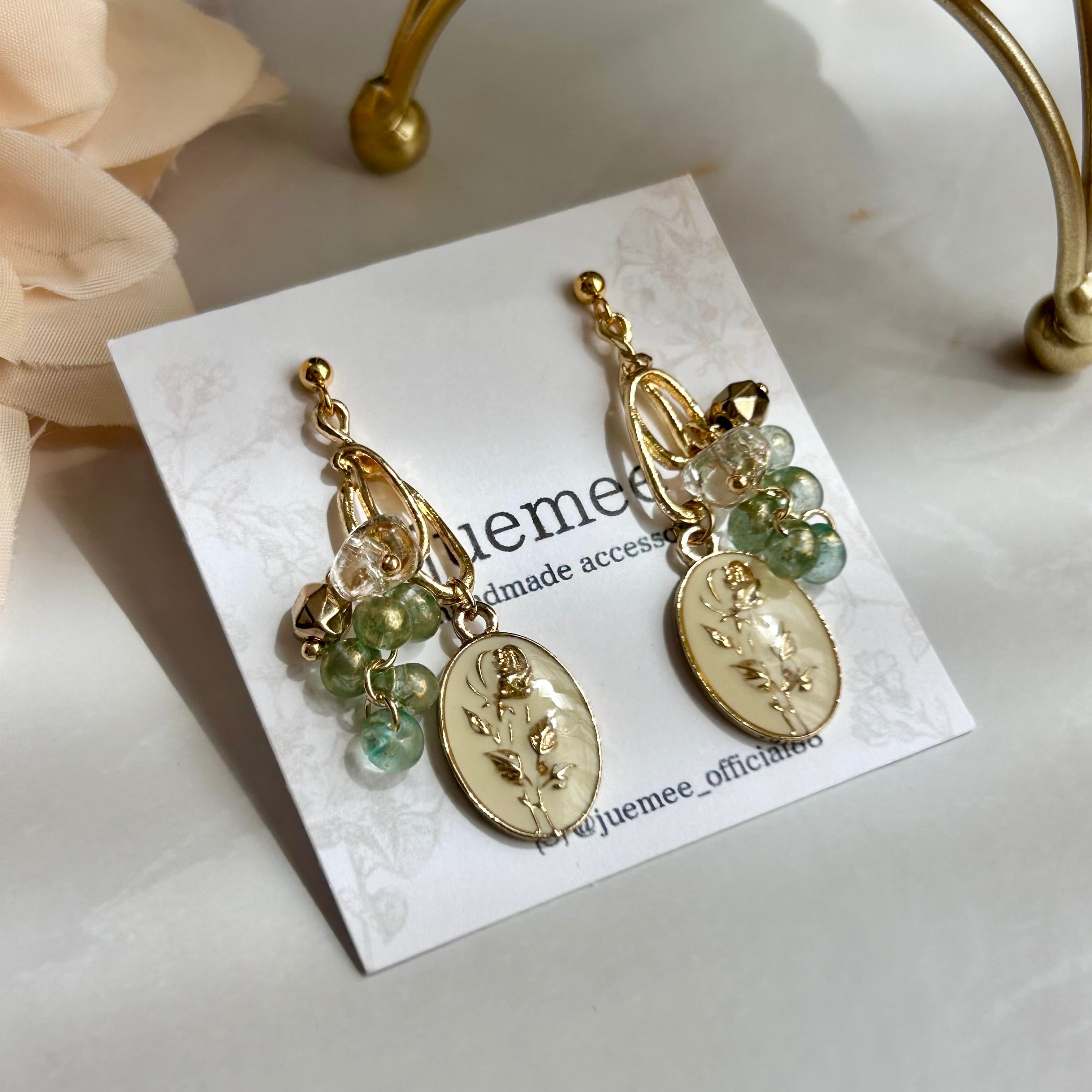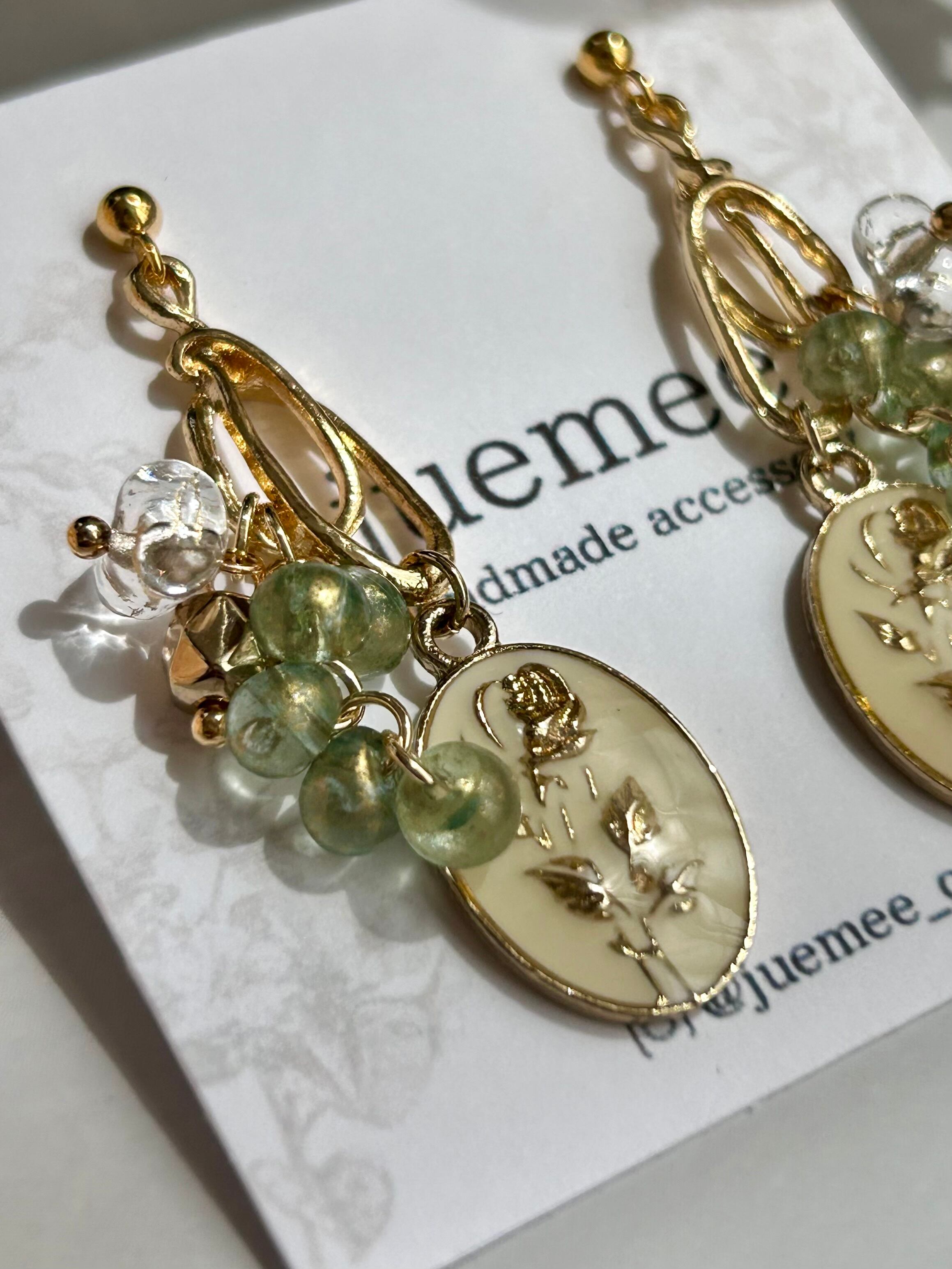 優しいグリーンのビーズと、どこか懐かしさを感じるバラのモチーフ。
