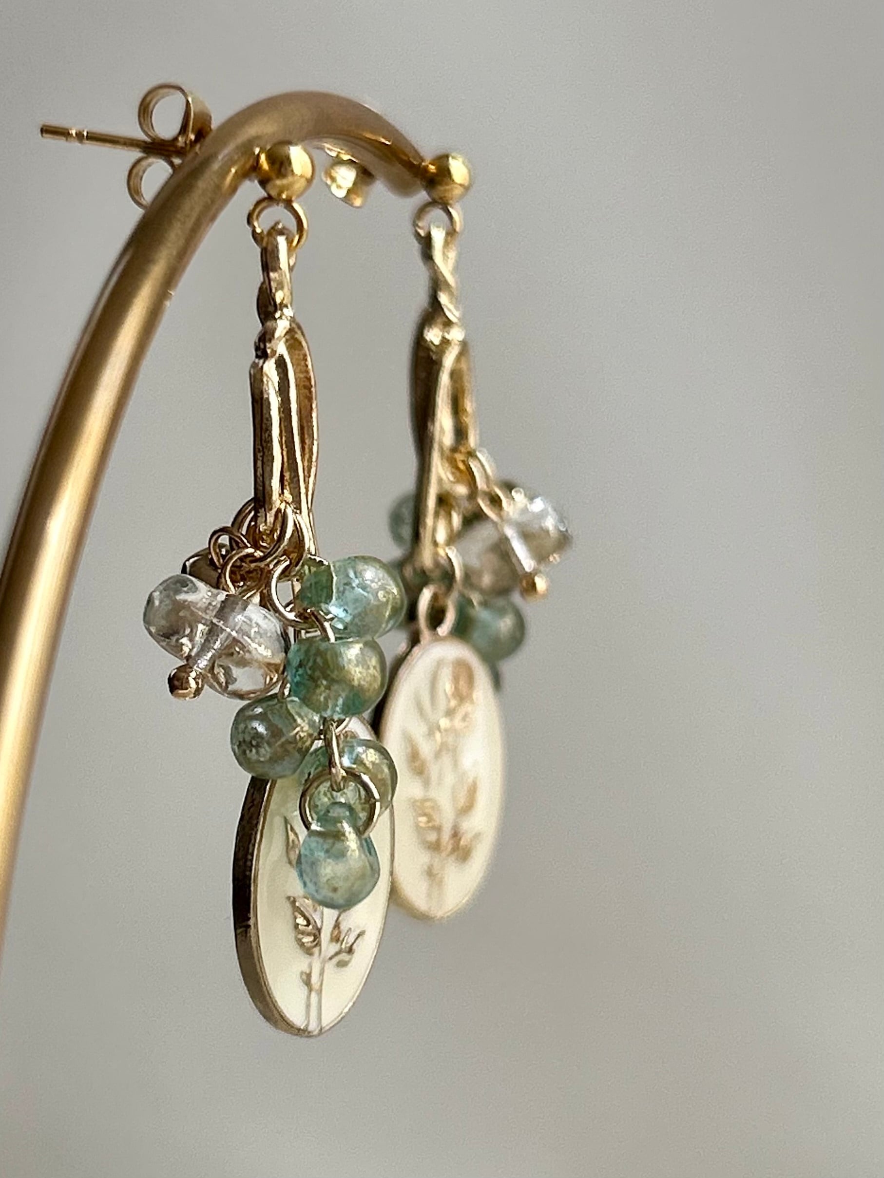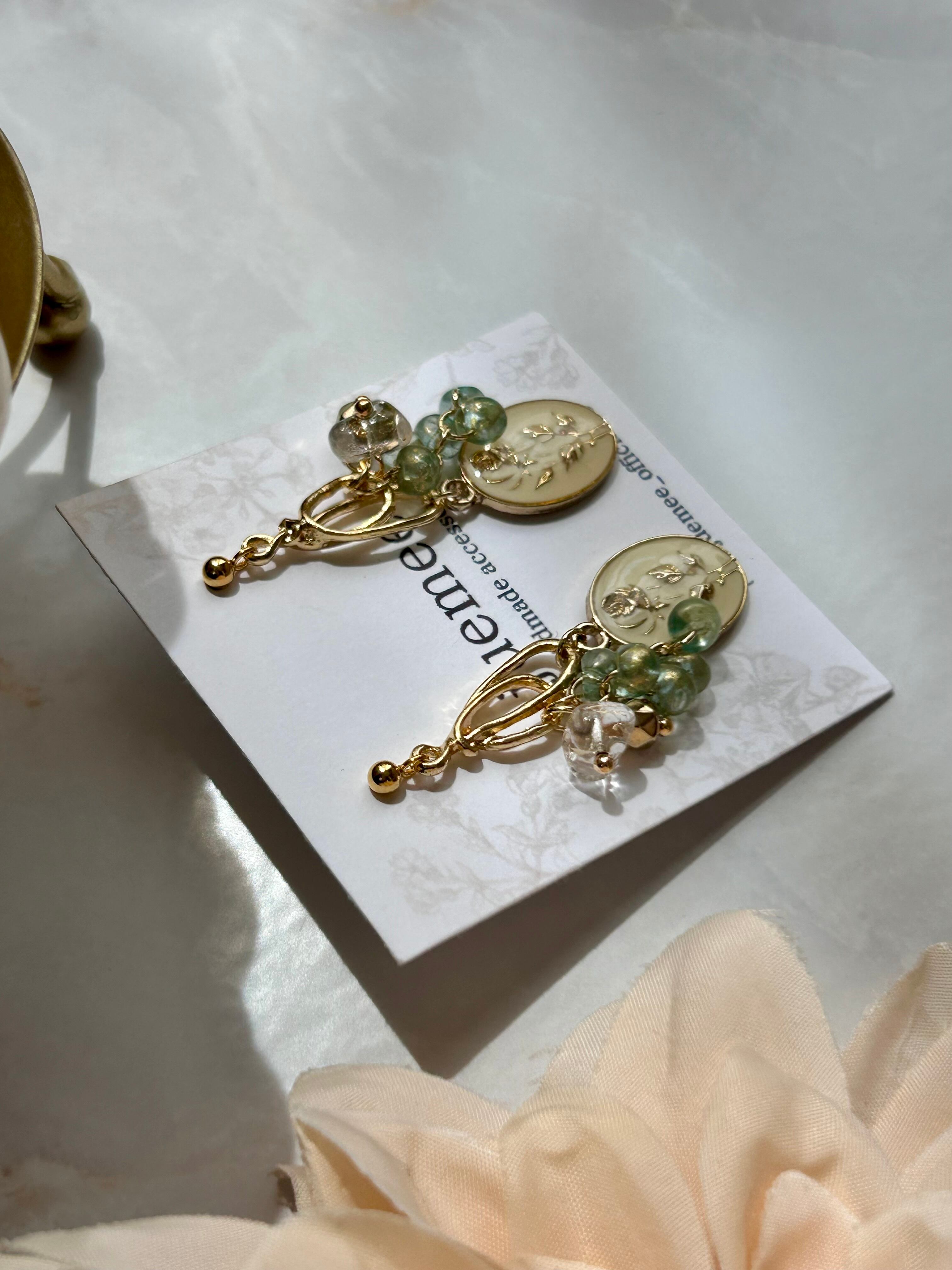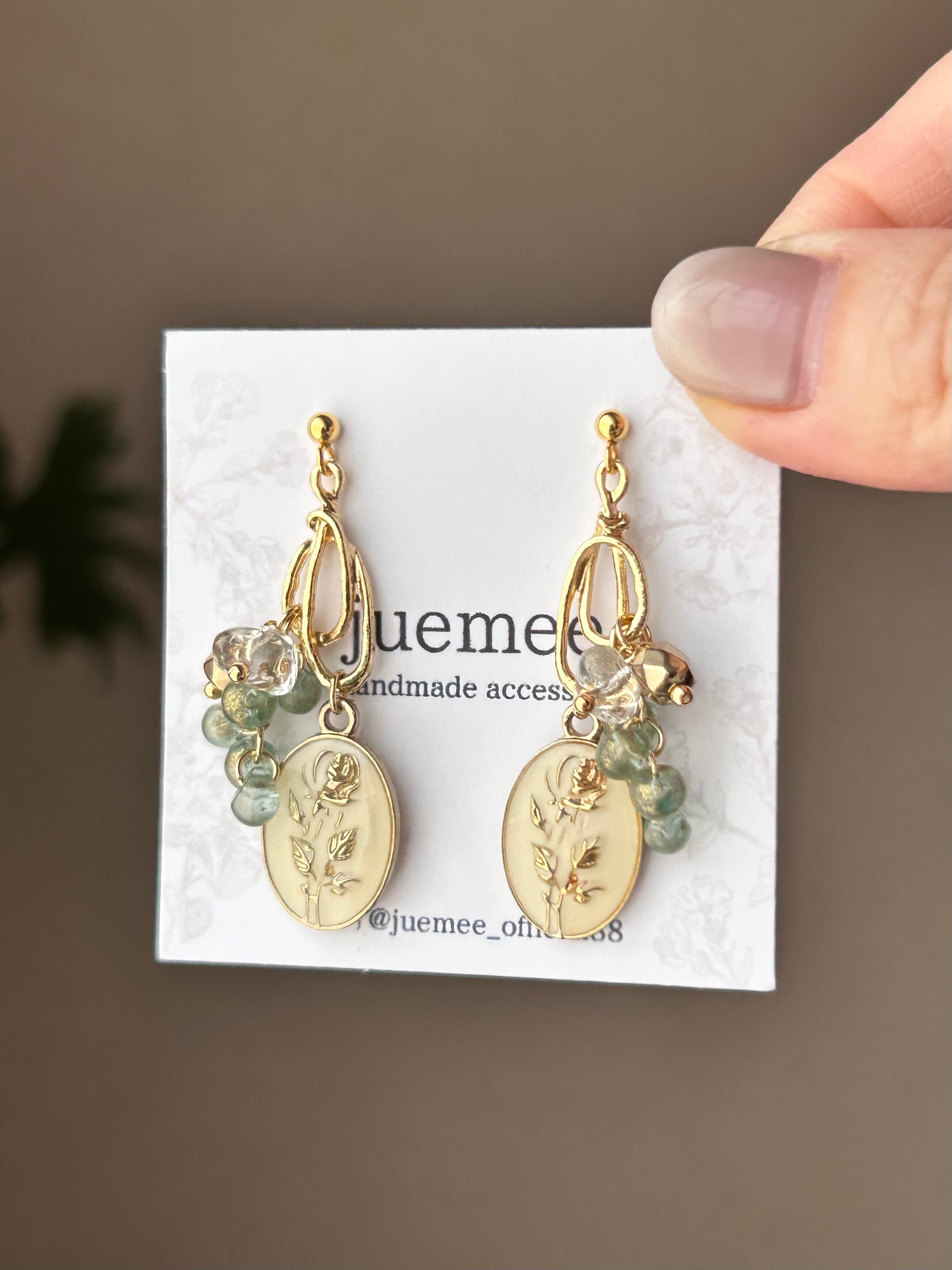優しいグリーンのビーズと、どこか懐かしさを感じるバラのモチーフ。