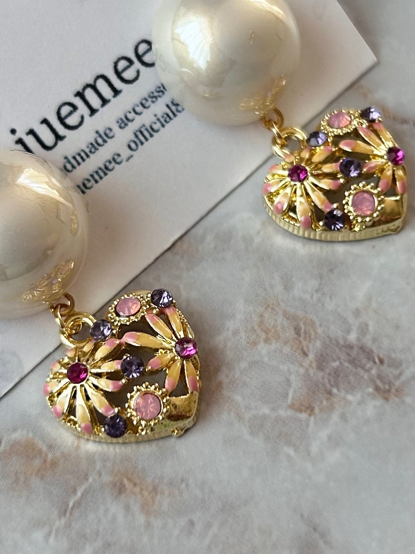 その下で、パープルのラインストーンやピンクの小花たちが咲き誇るハートチャームが揺れて、