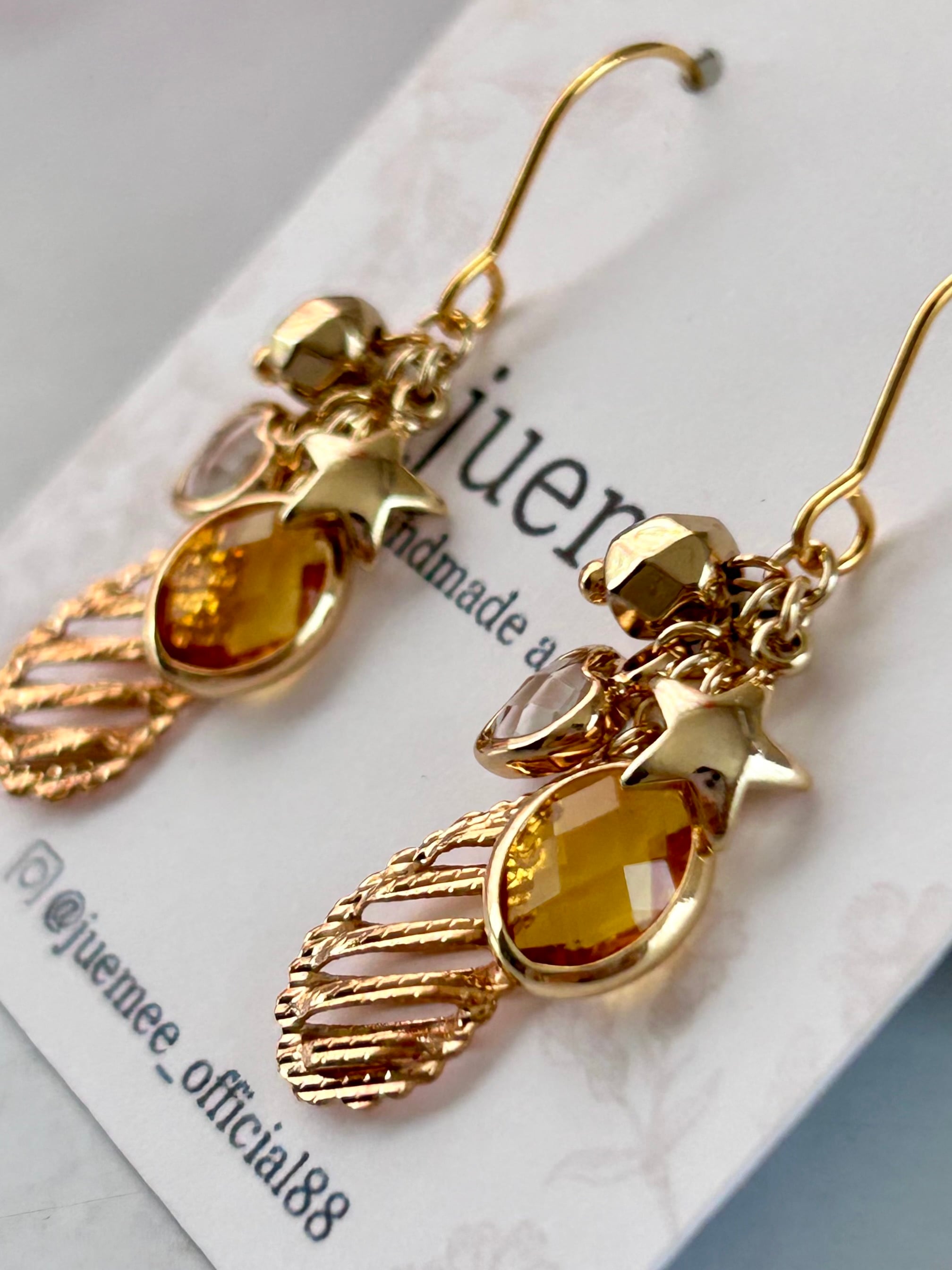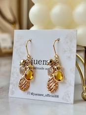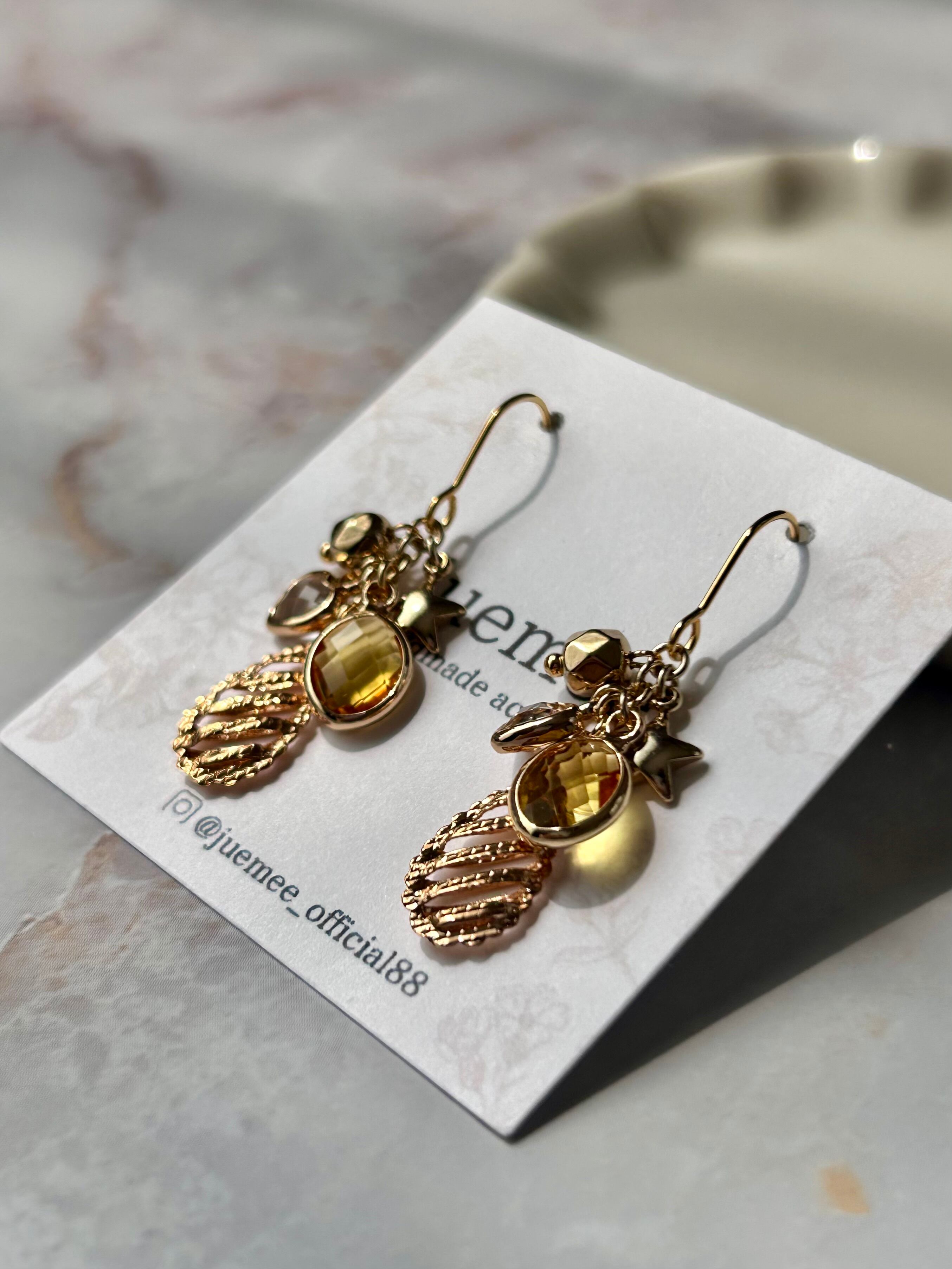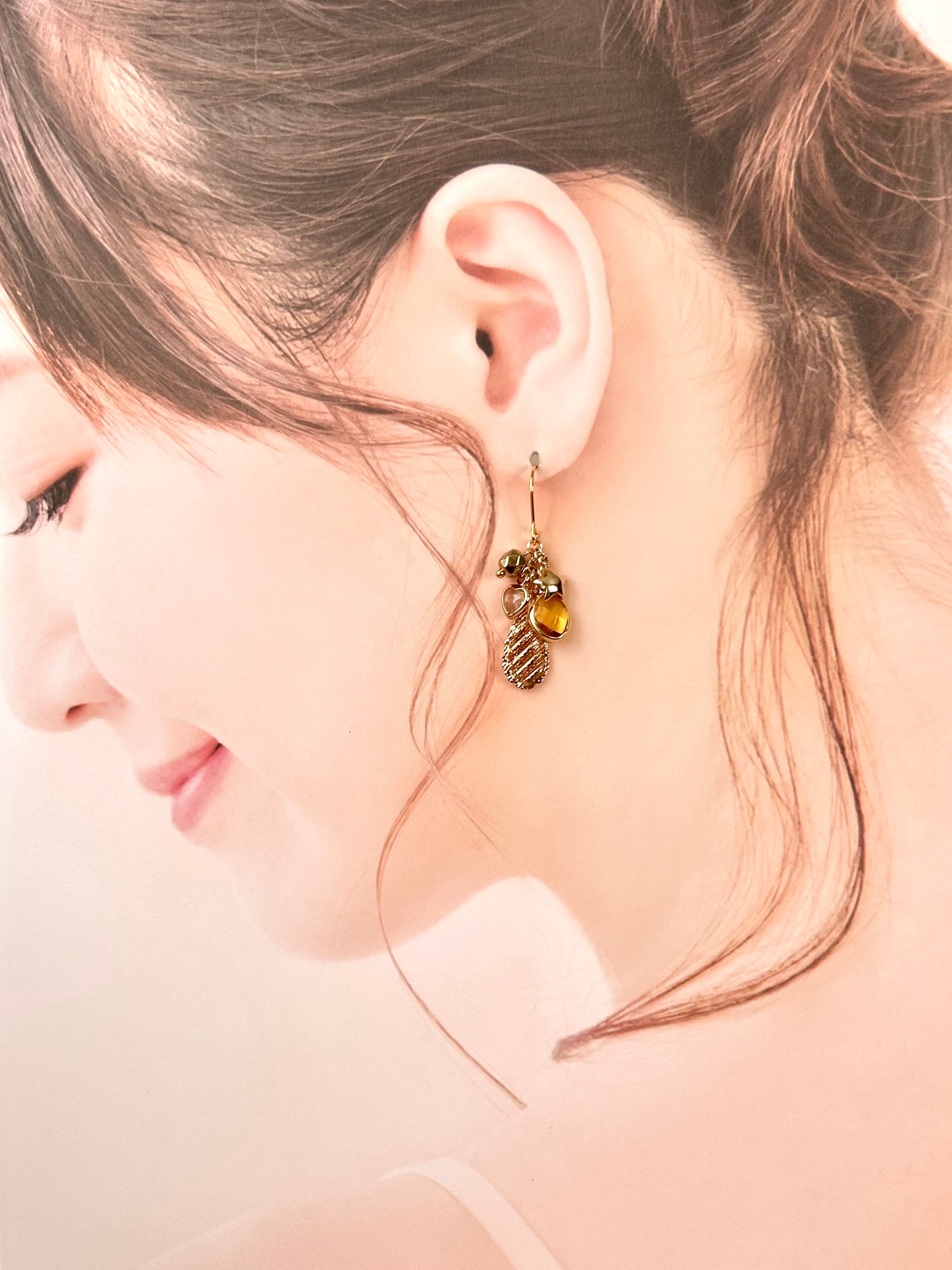 元気をくれるイエローのガラスチャームと、ころんとした小さな星のチャームたちが、耳元で軽やかにきらめきます。