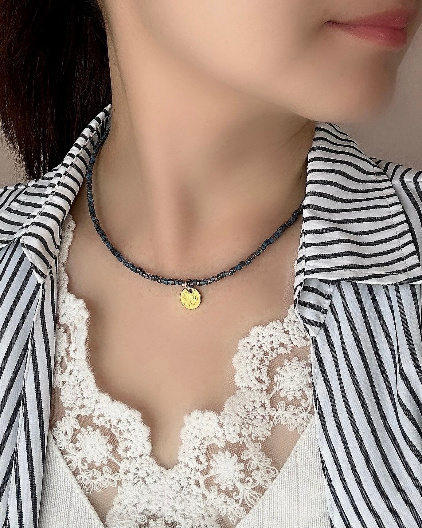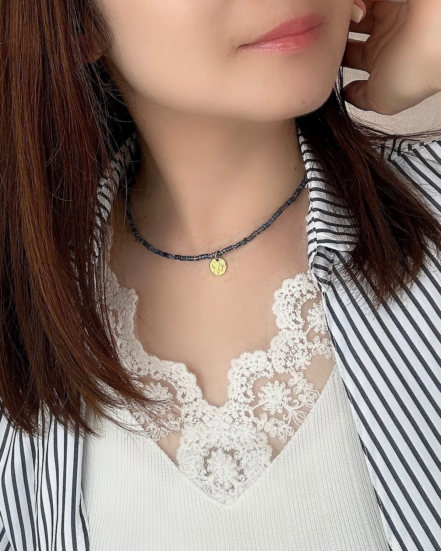 ガラスならではの艶感と、ゴールドカラーコーティングの上品な輝きが、大人の女性の首元に繊細な存在感をプラスします。