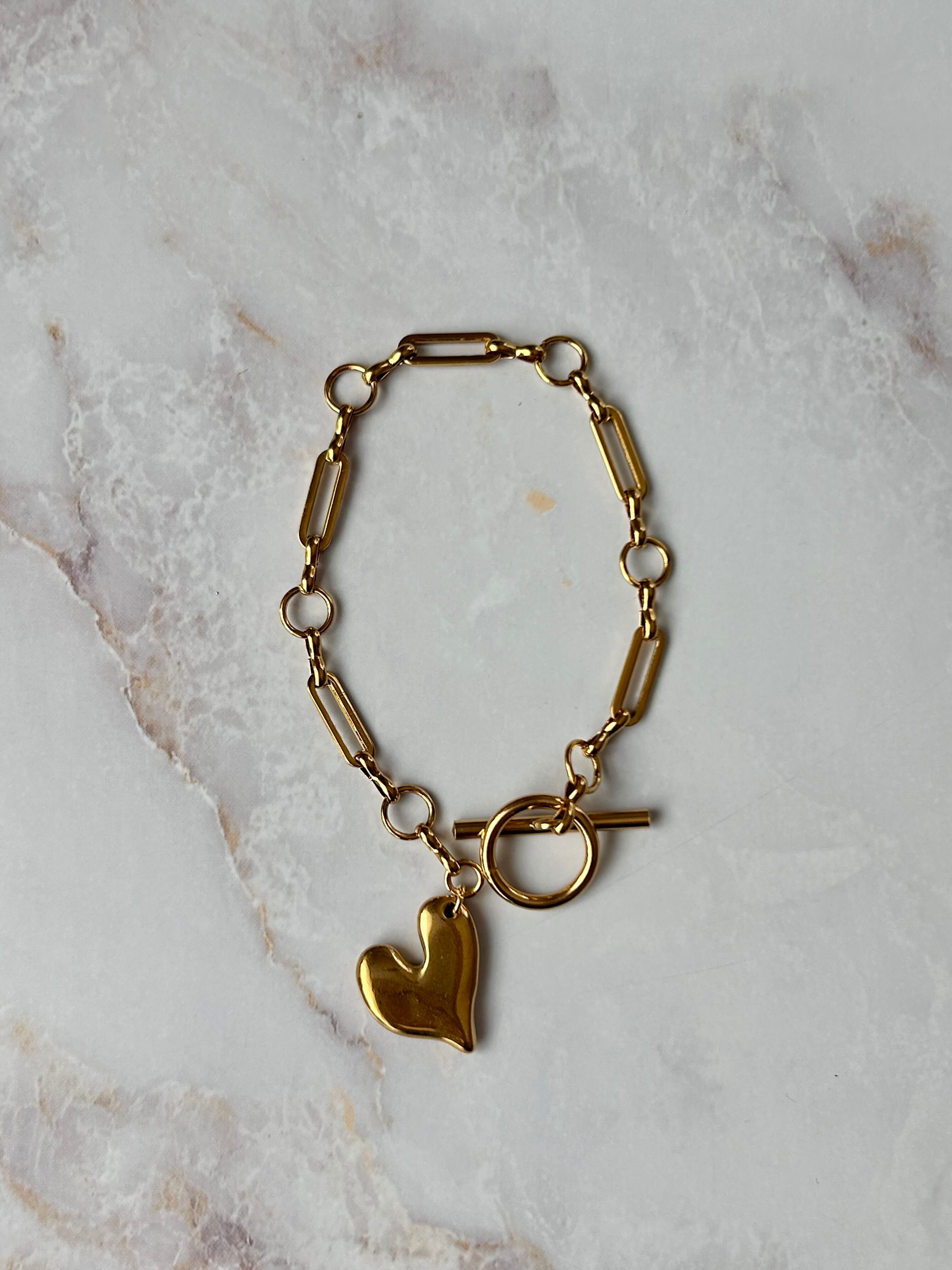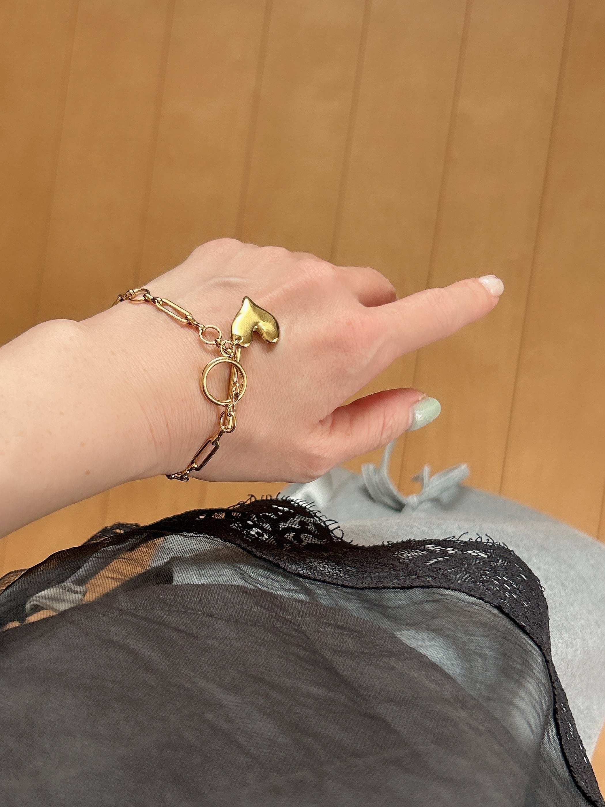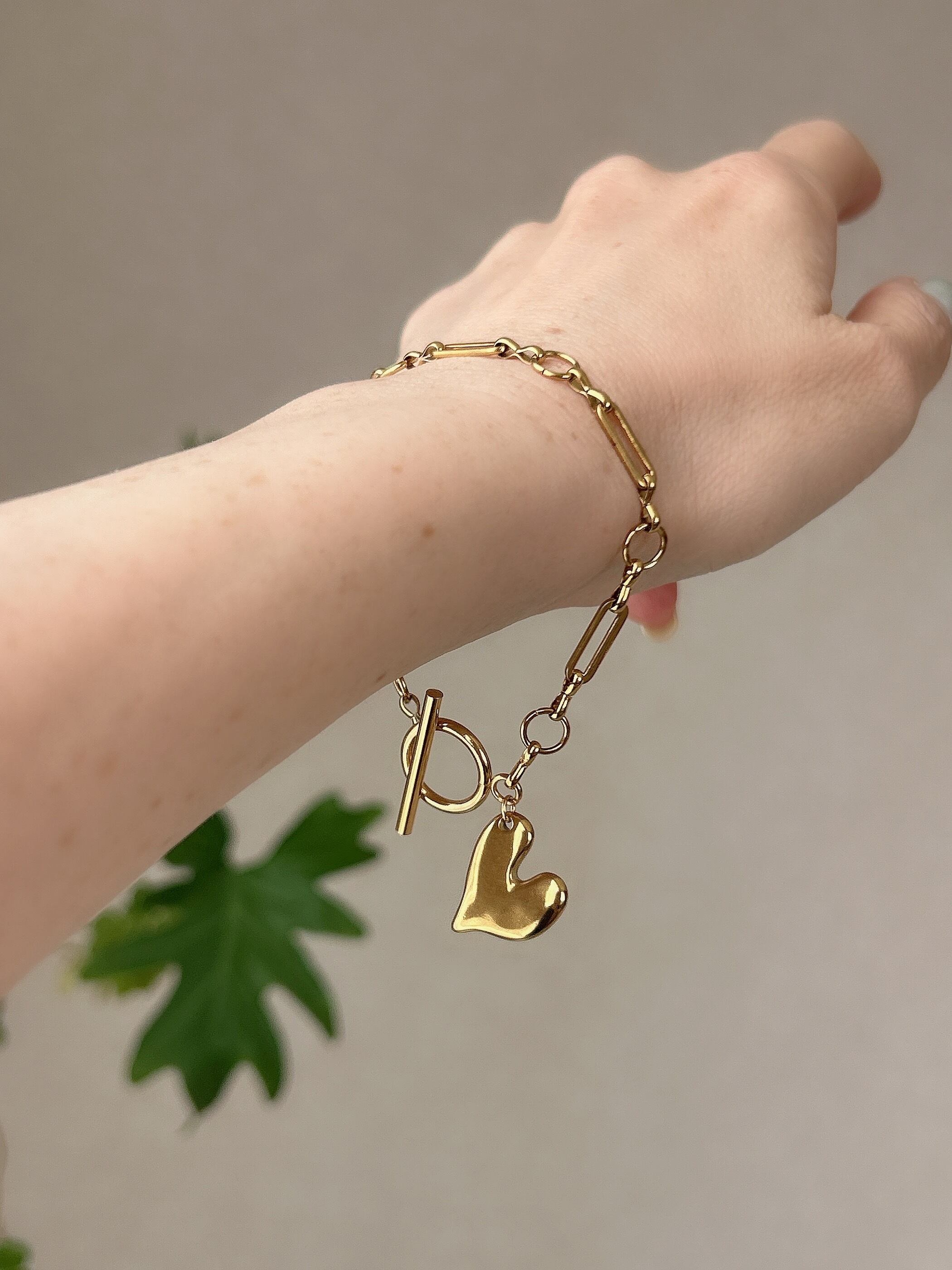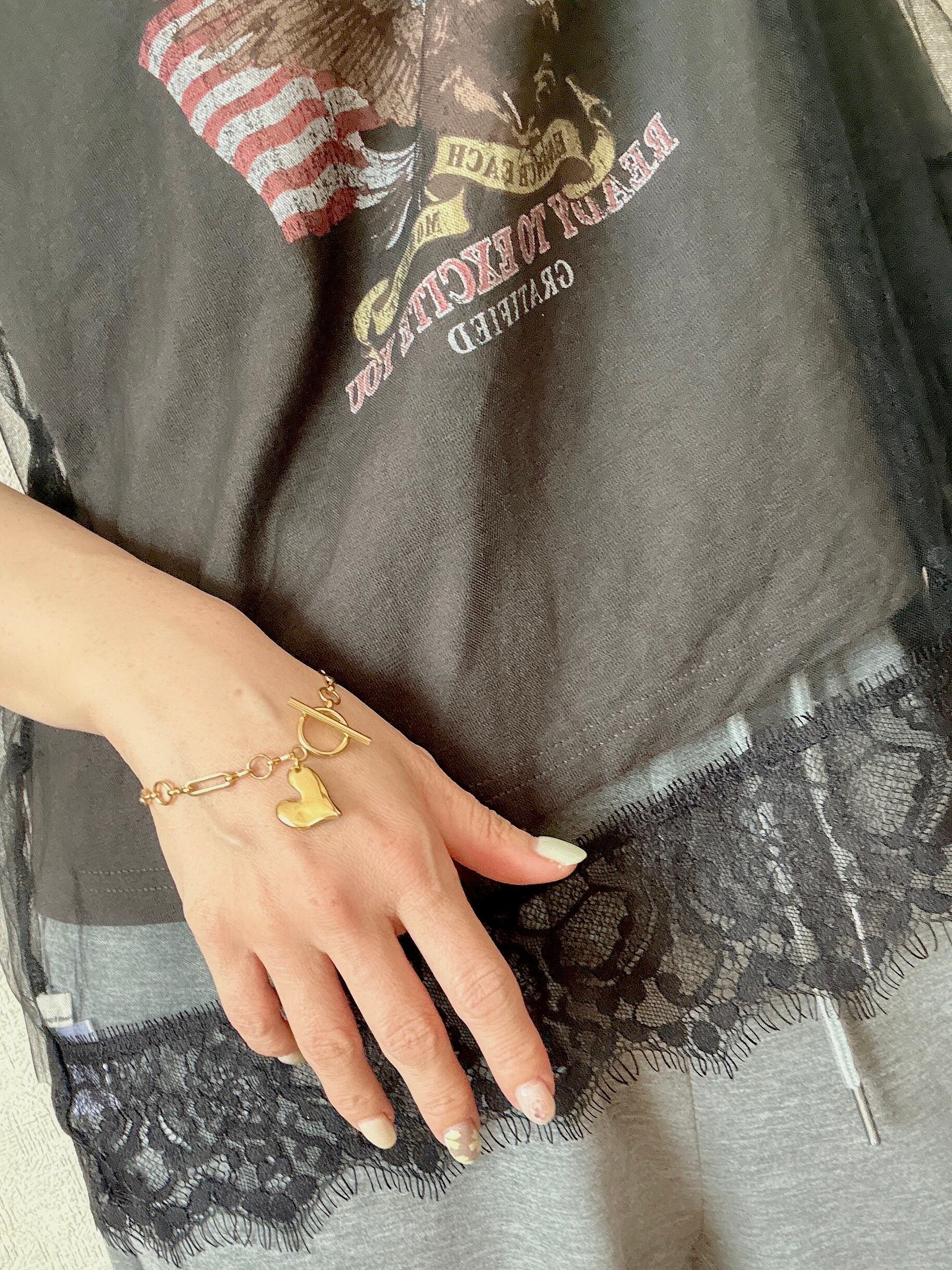 くったりとしたフォルムが印象的なハートチャームが、手首の動きに合わせて軽やかに揺れるブレスレットです。