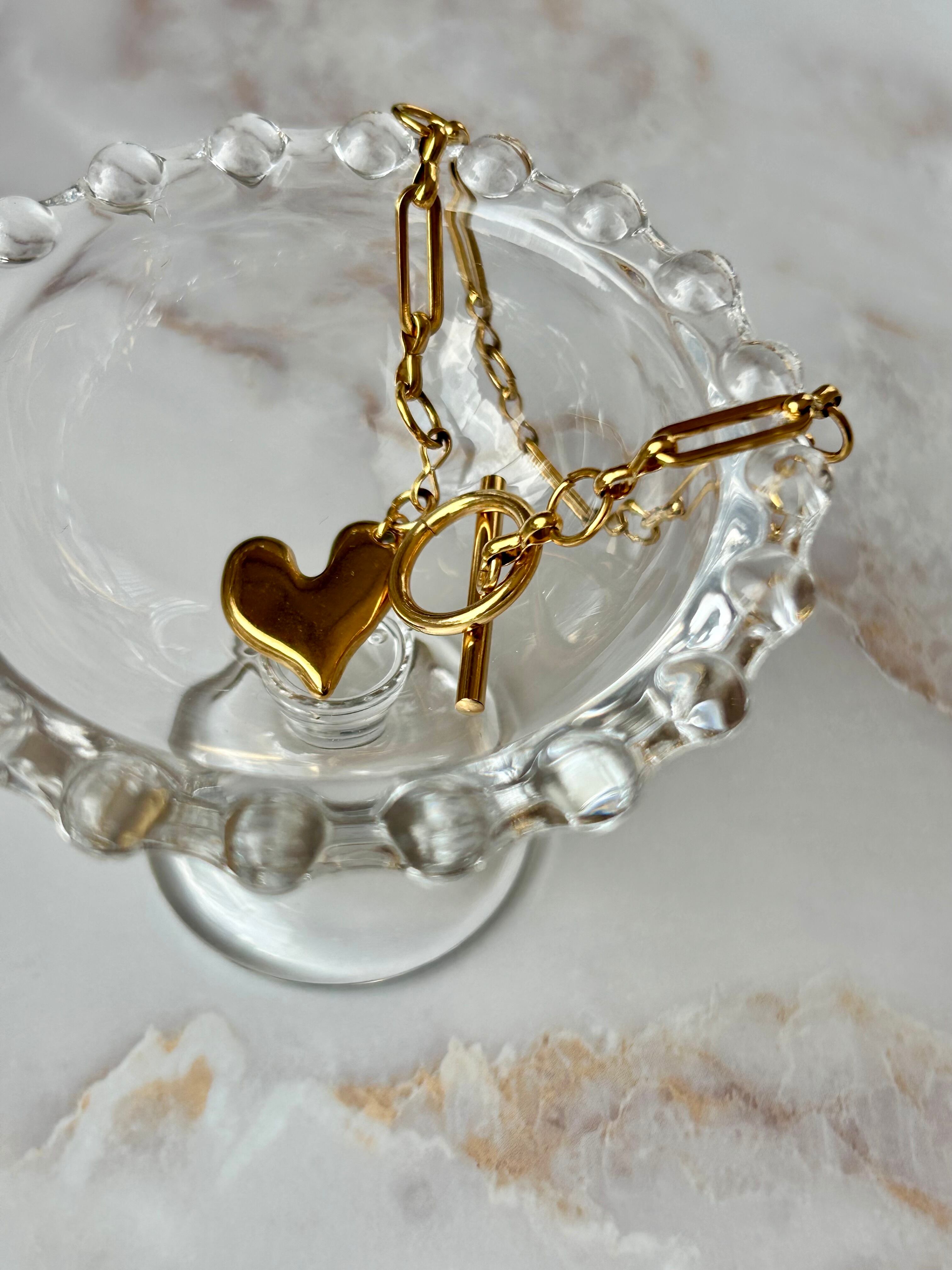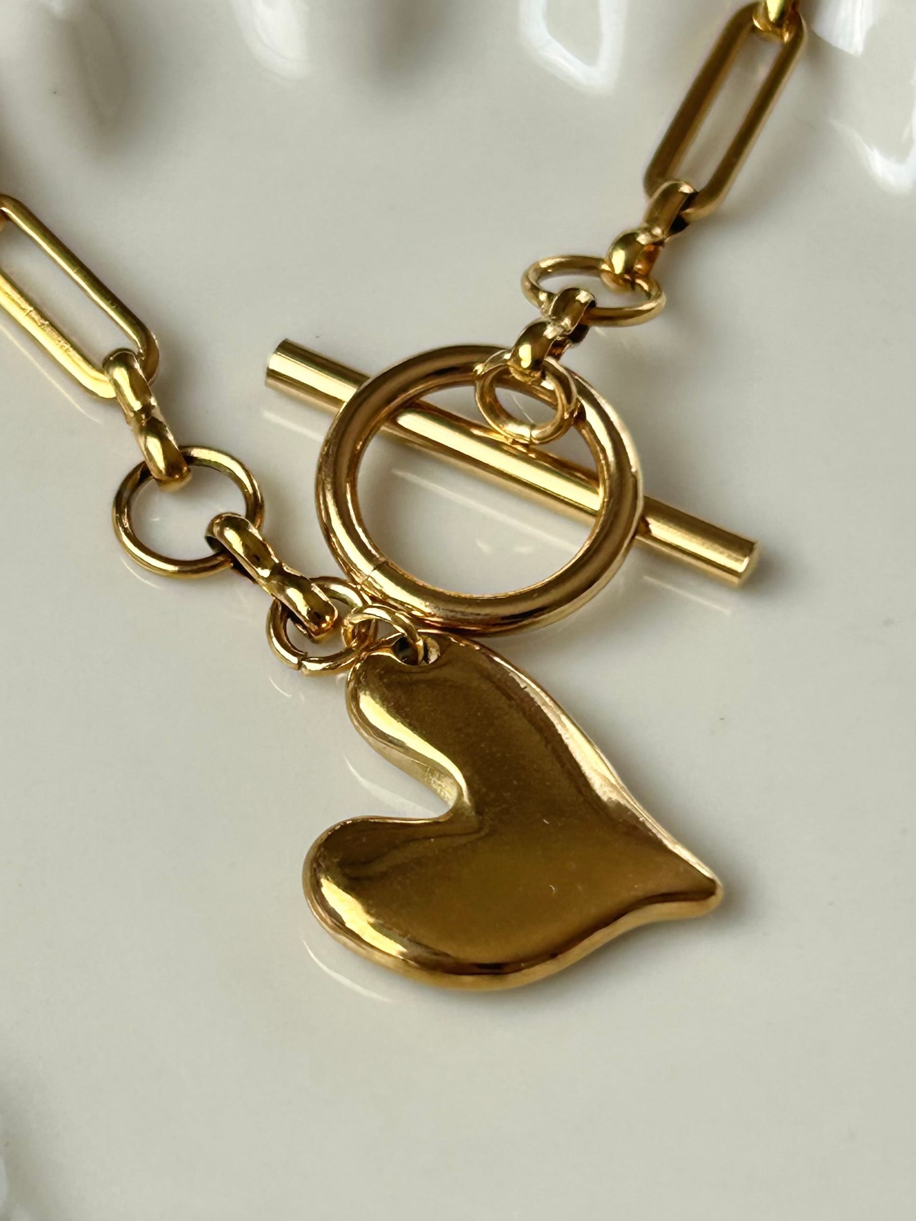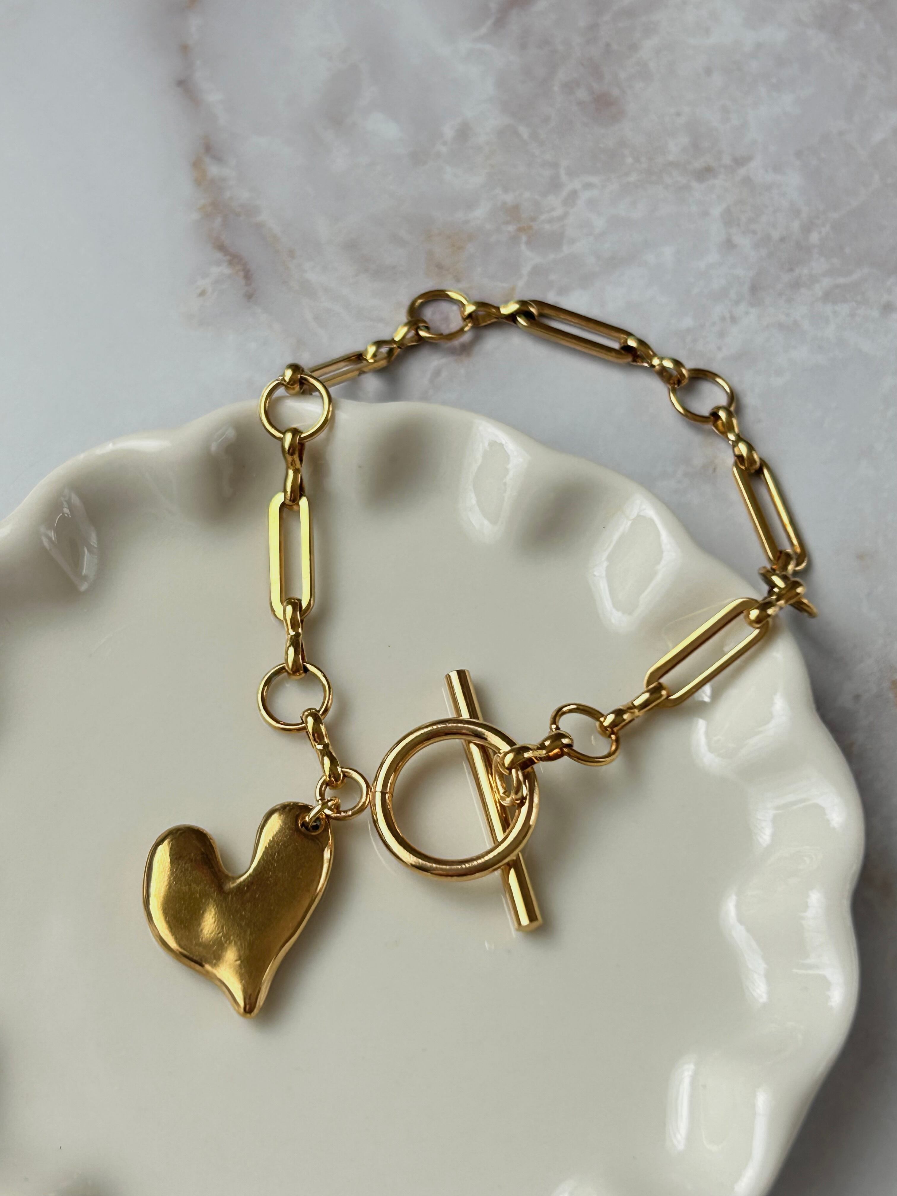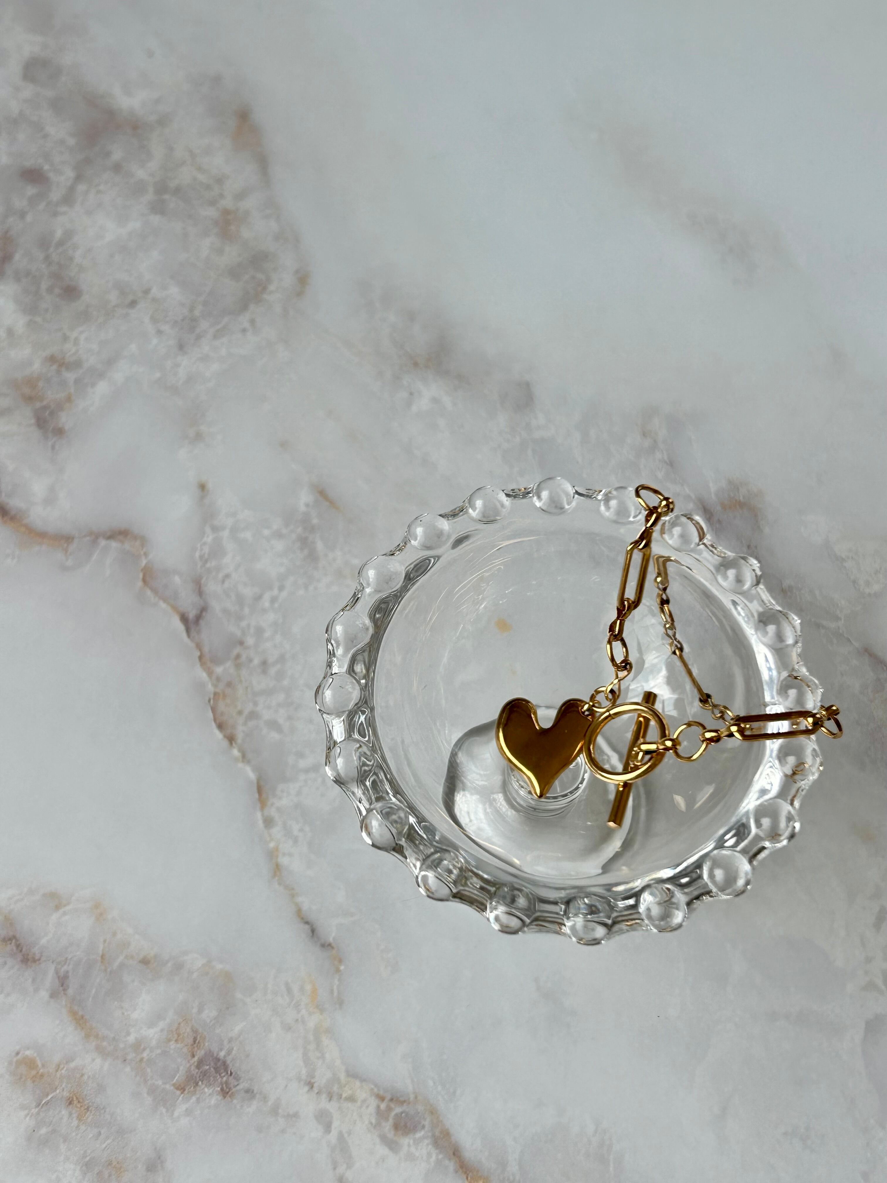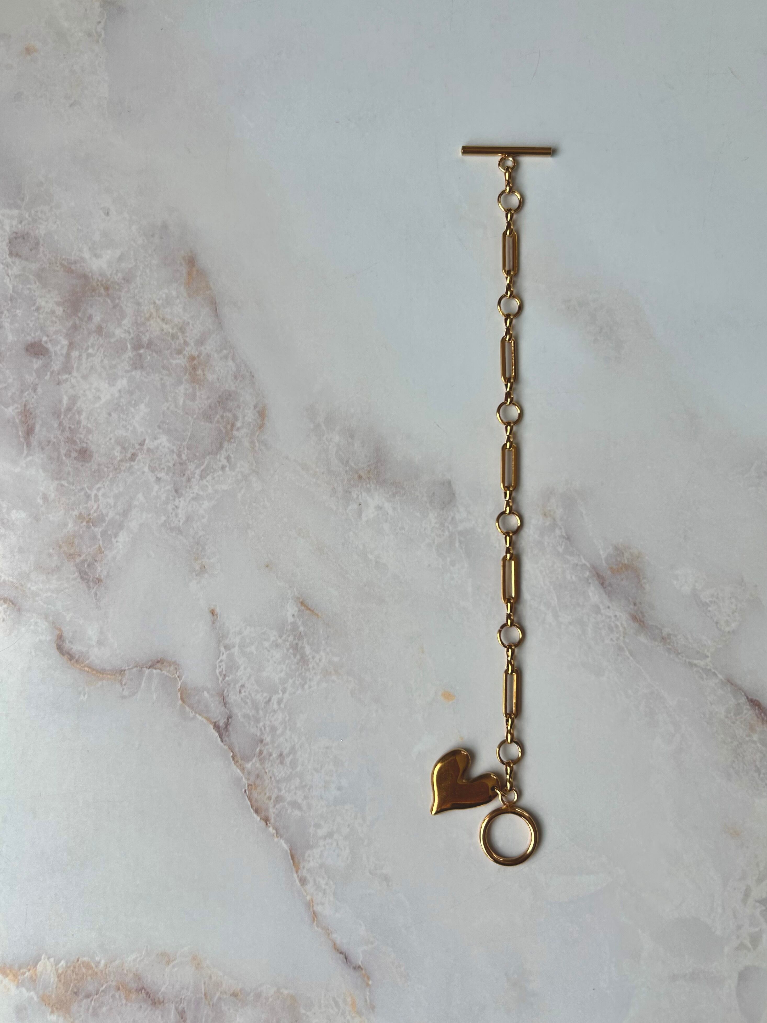 くったりとしたフォルムが印象的なハートチャームが、手首の動きに合わせて軽やかに揺れるブレスレットです。