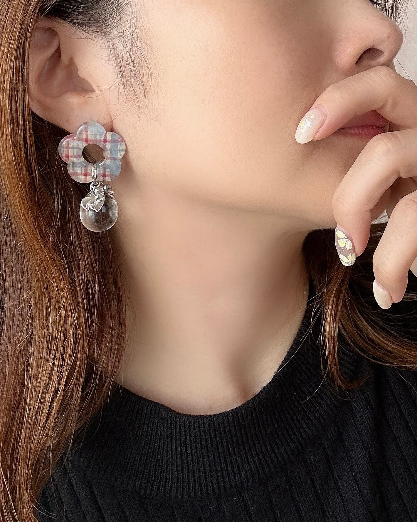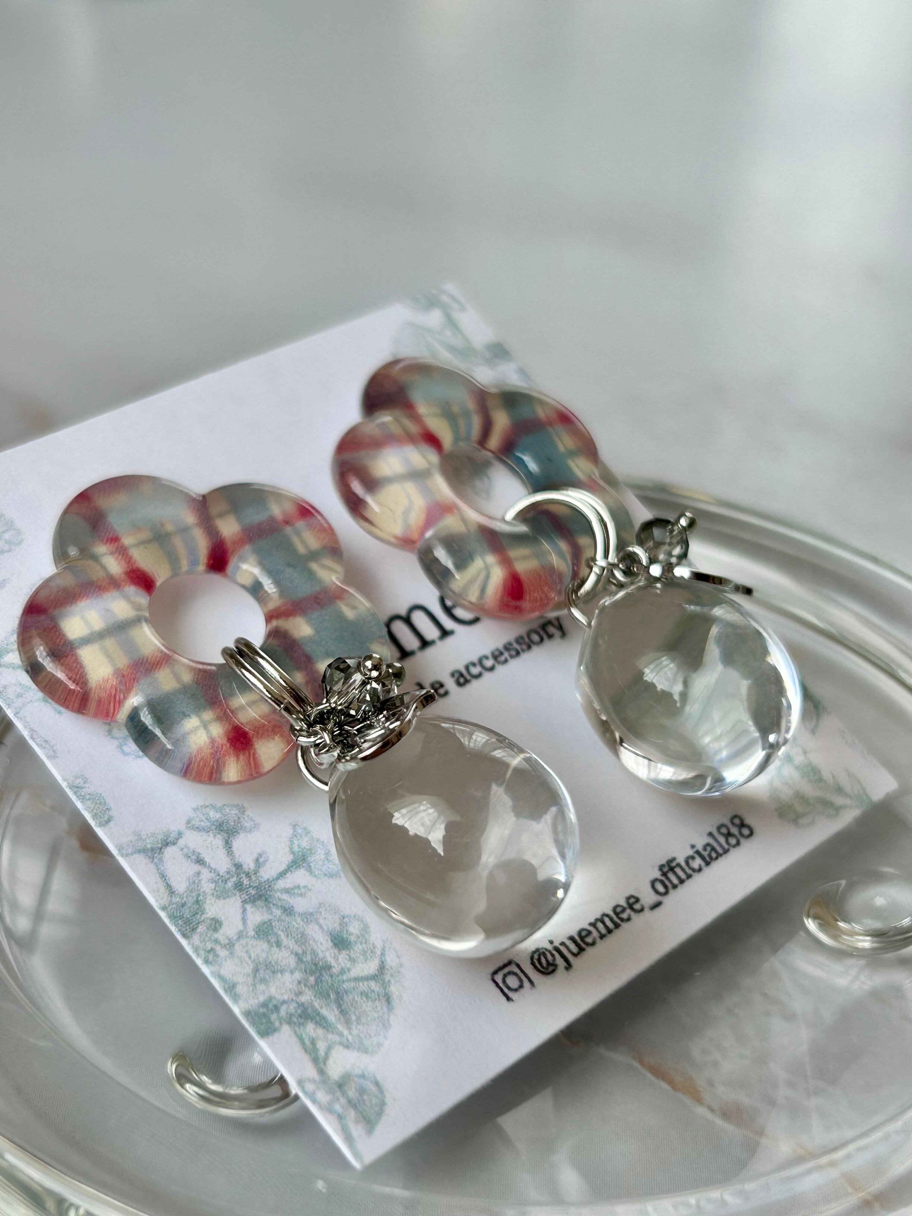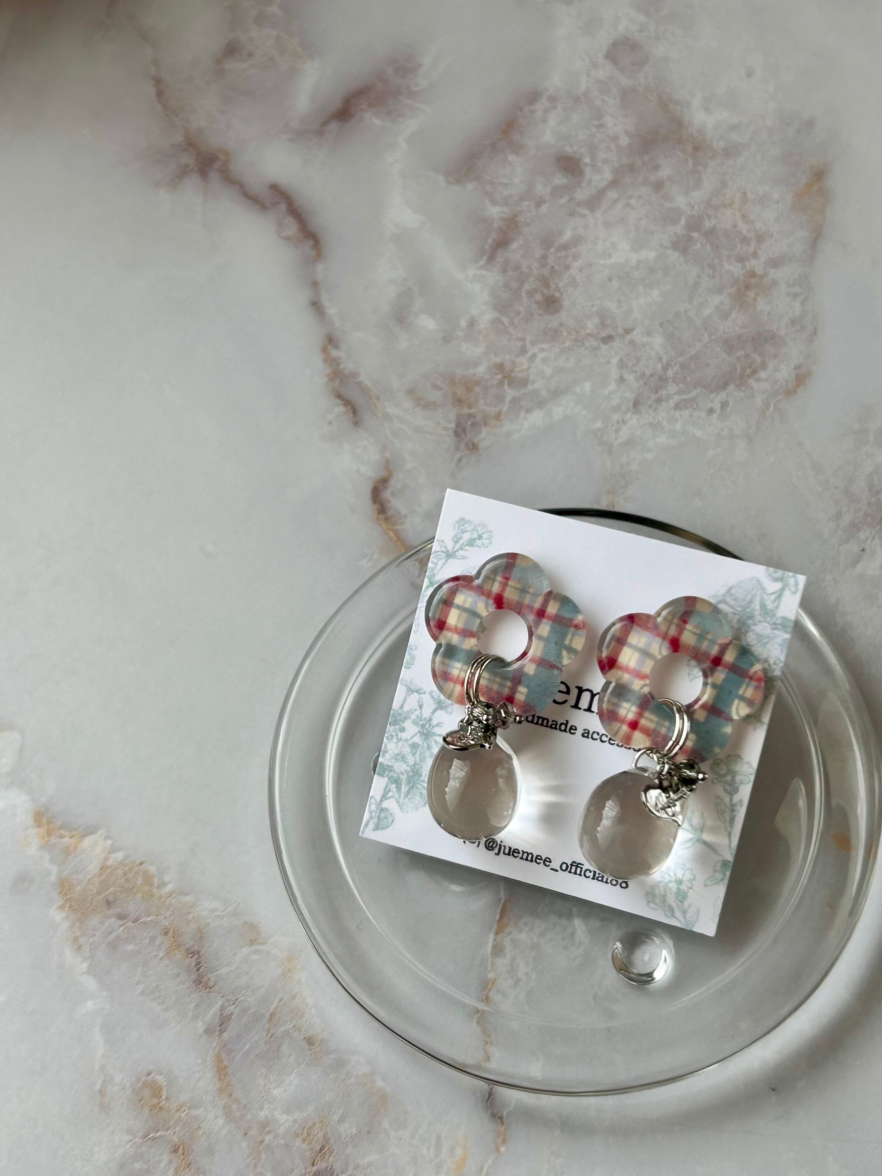 カジュアルなチェック柄のお花モチーフに、ころんと透明感のあるドロップを合わせた、遊び心あふれるデザイン!