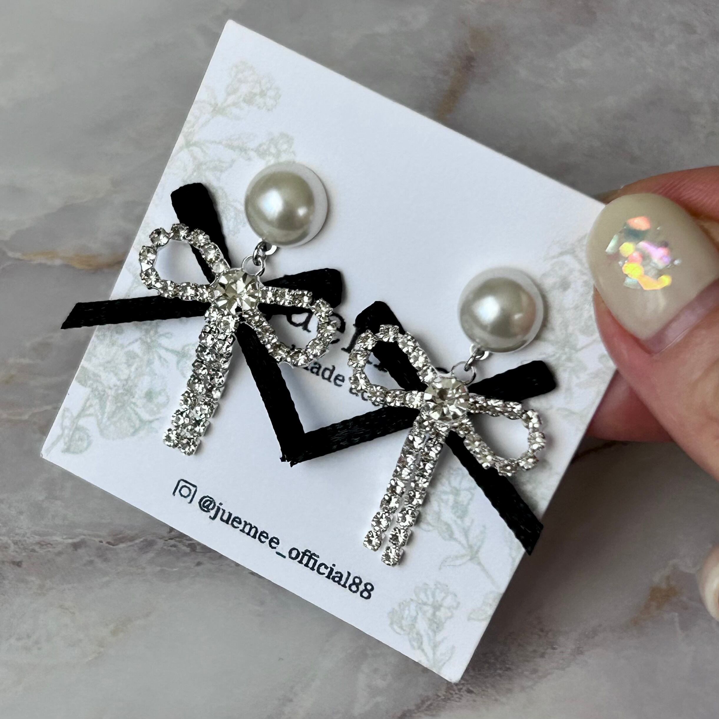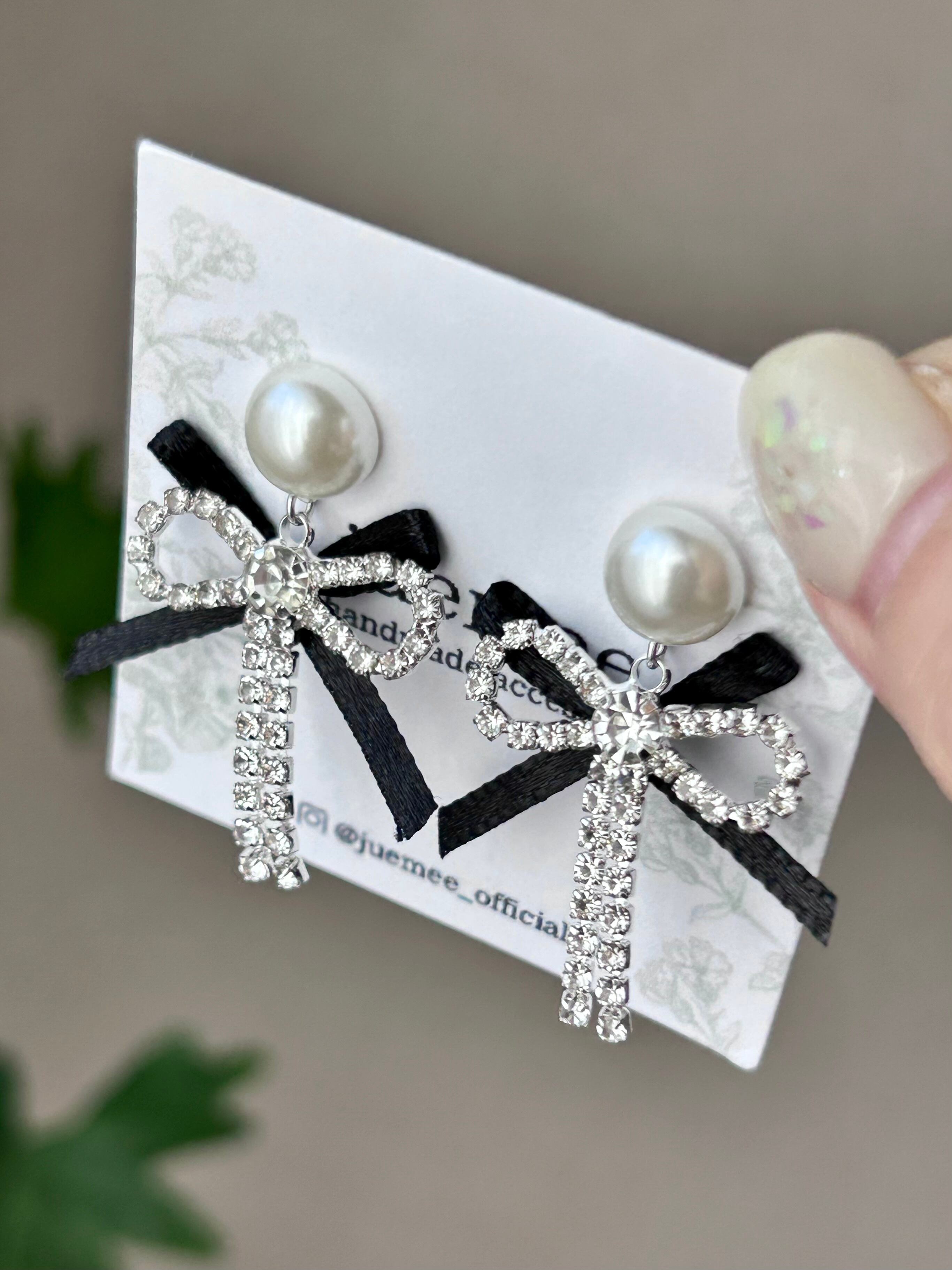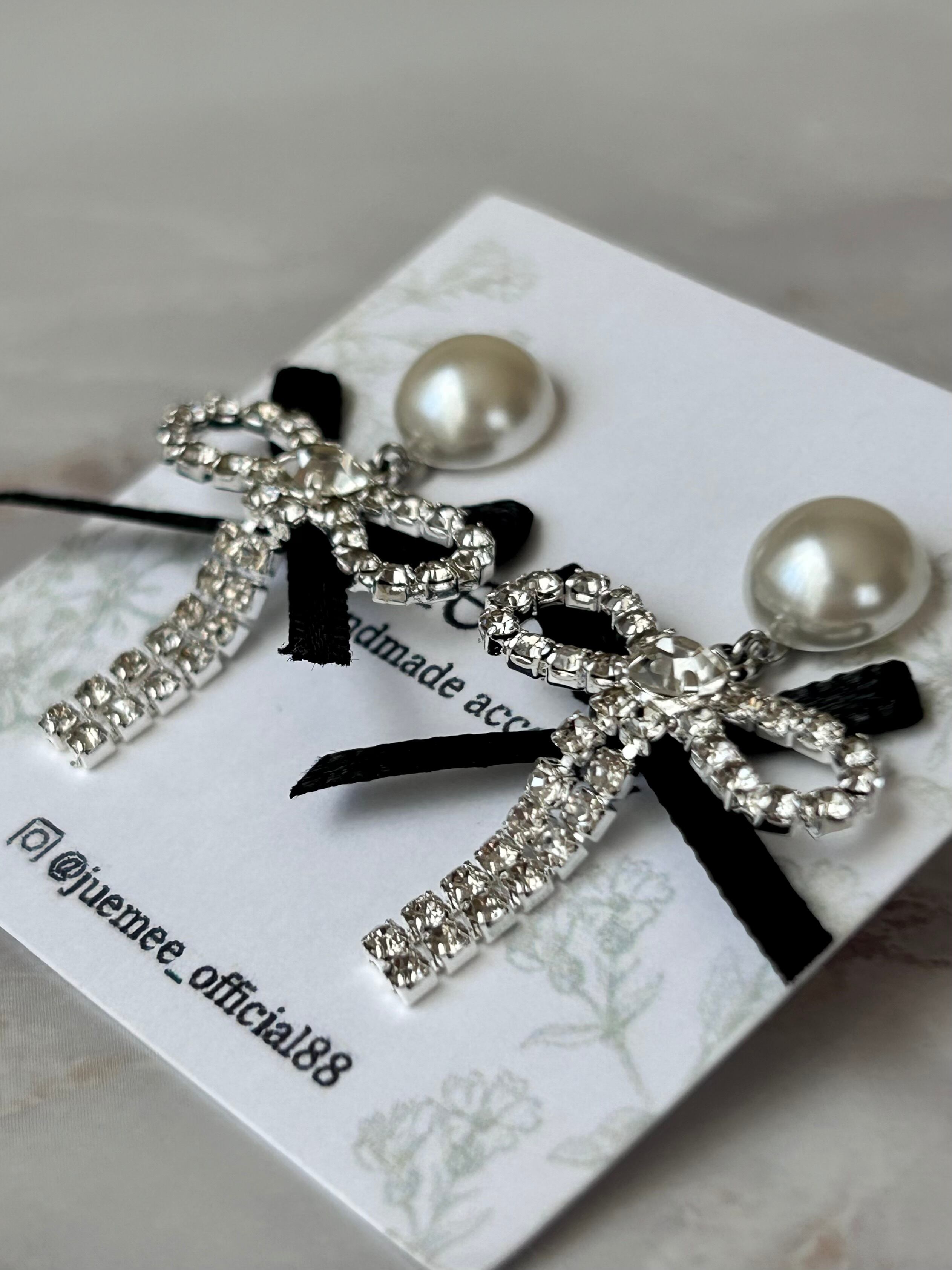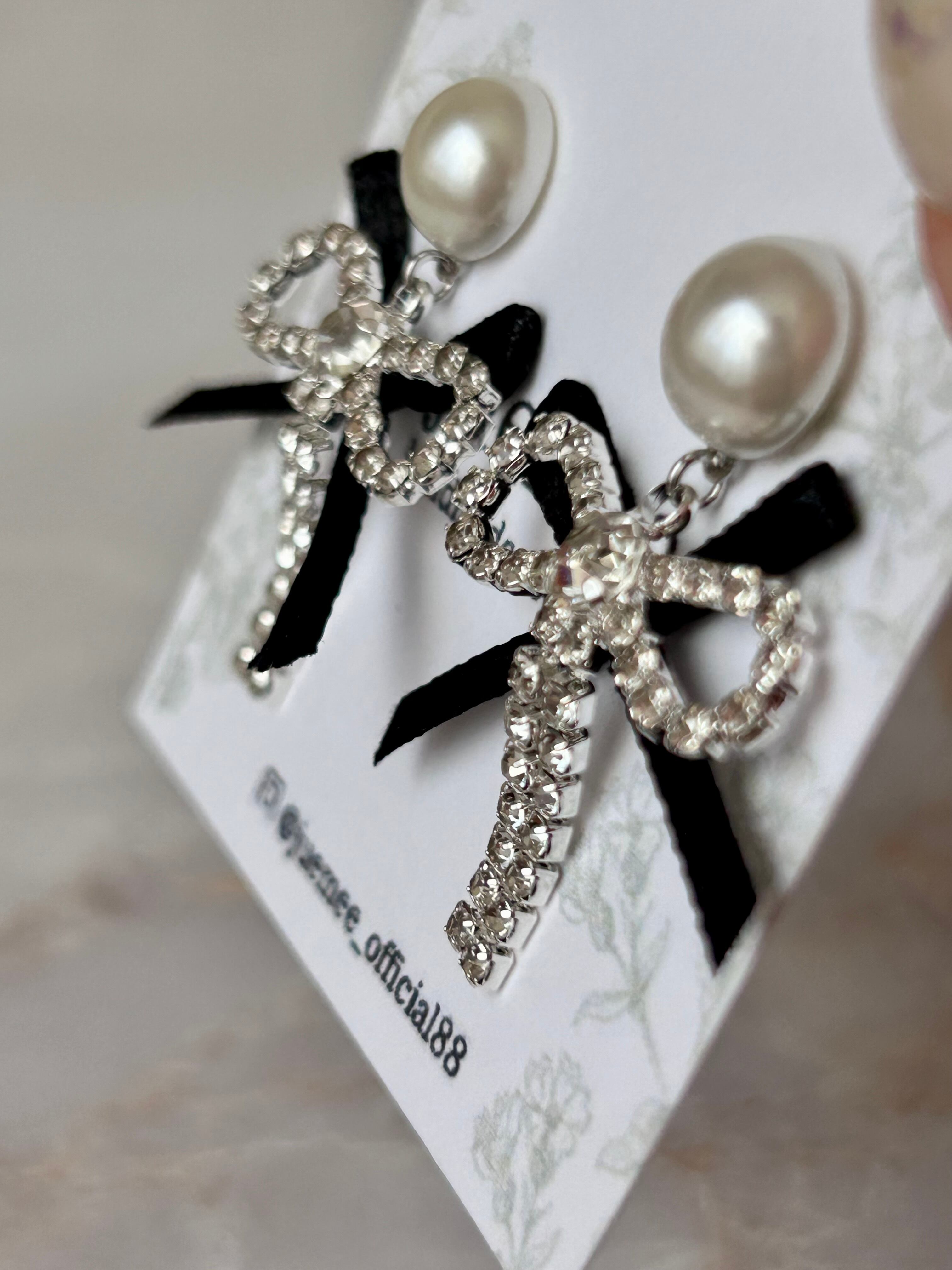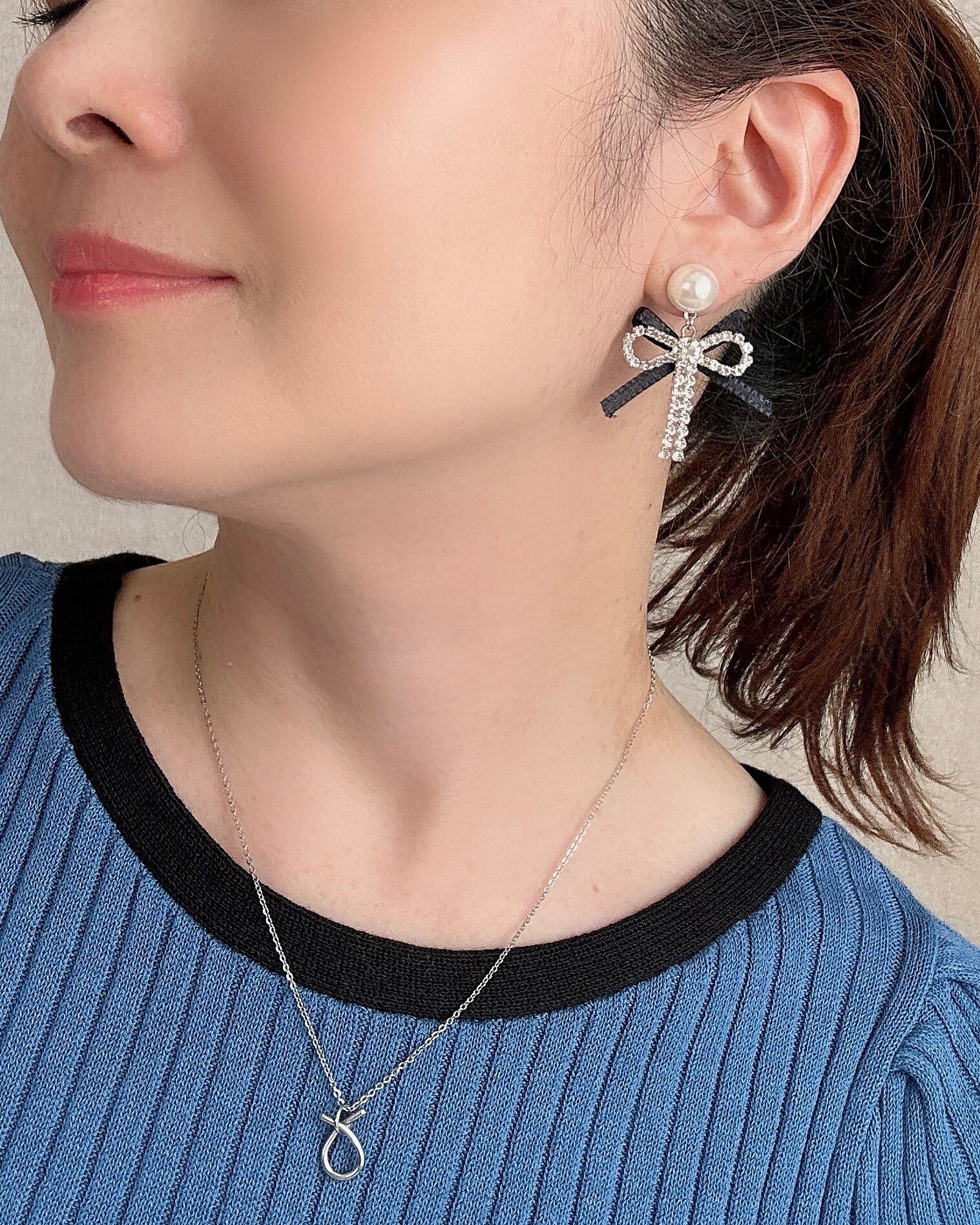 クラシカルなパールと、繊細に煌めくラインストーンリボンが絶妙なバランスで組み合わされた、存在感のあるピアス&イヤリング。