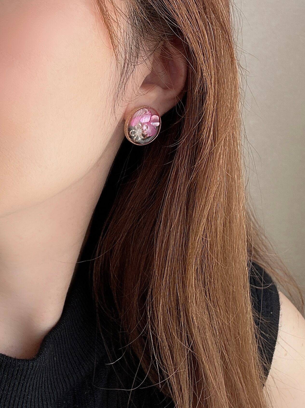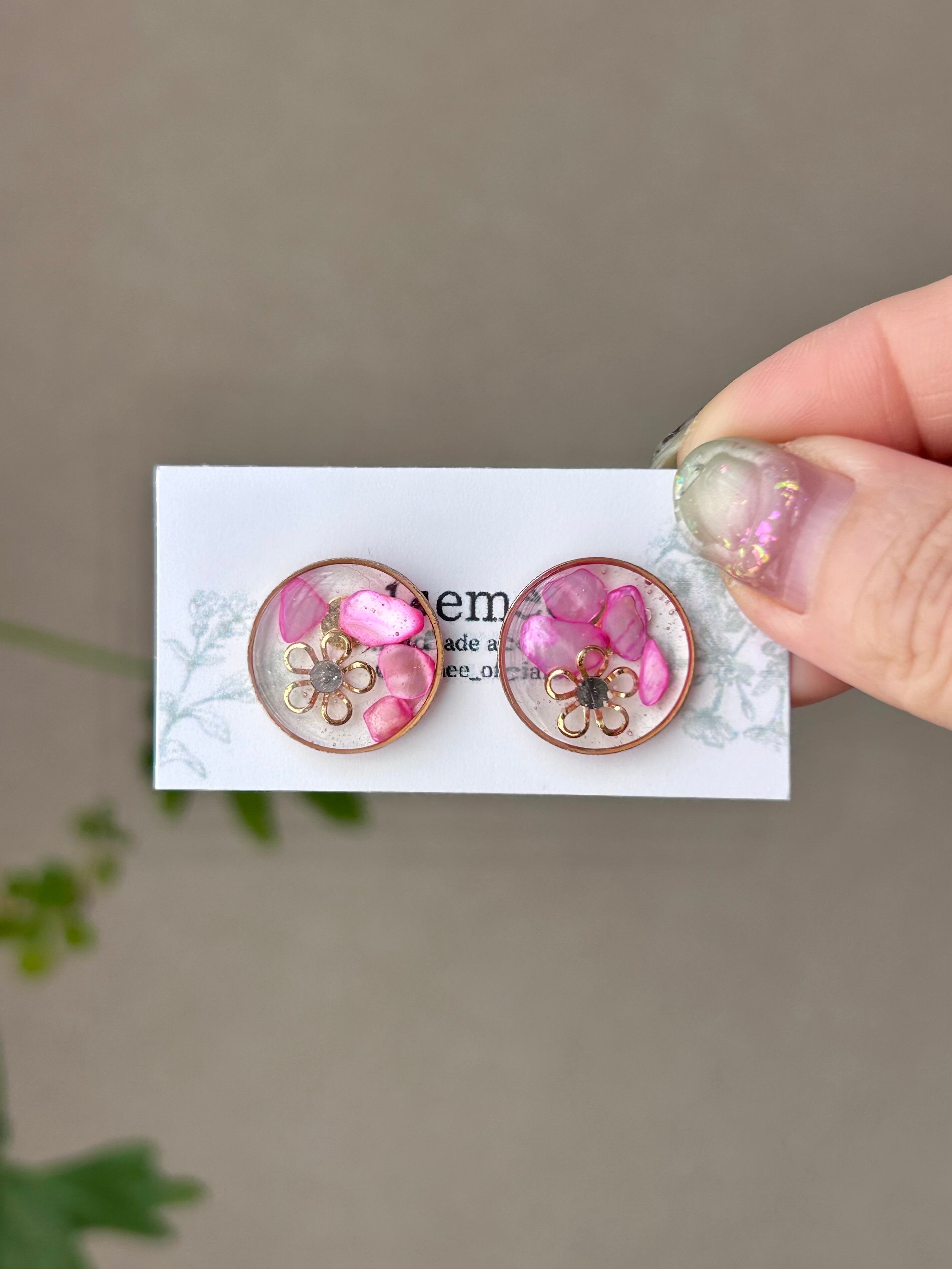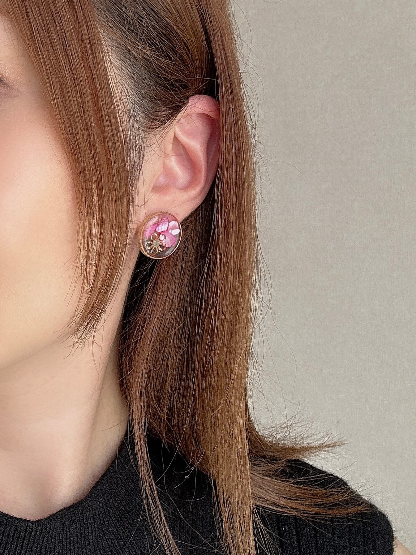 小花モチーフとピンクシェルを閉じ込めた、明るく華やぐピアス&イヤリング。