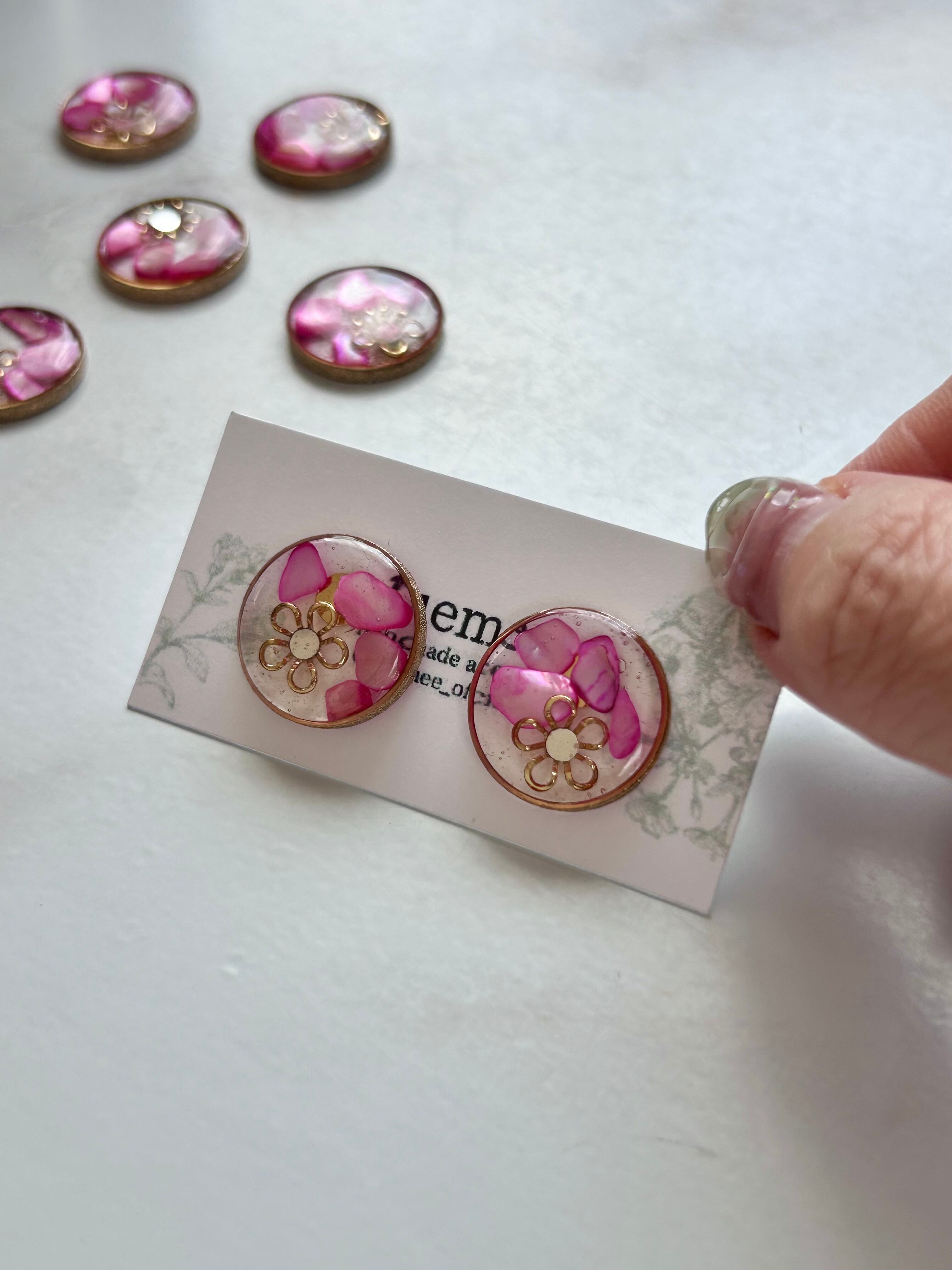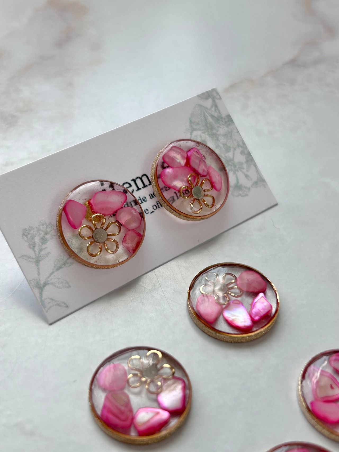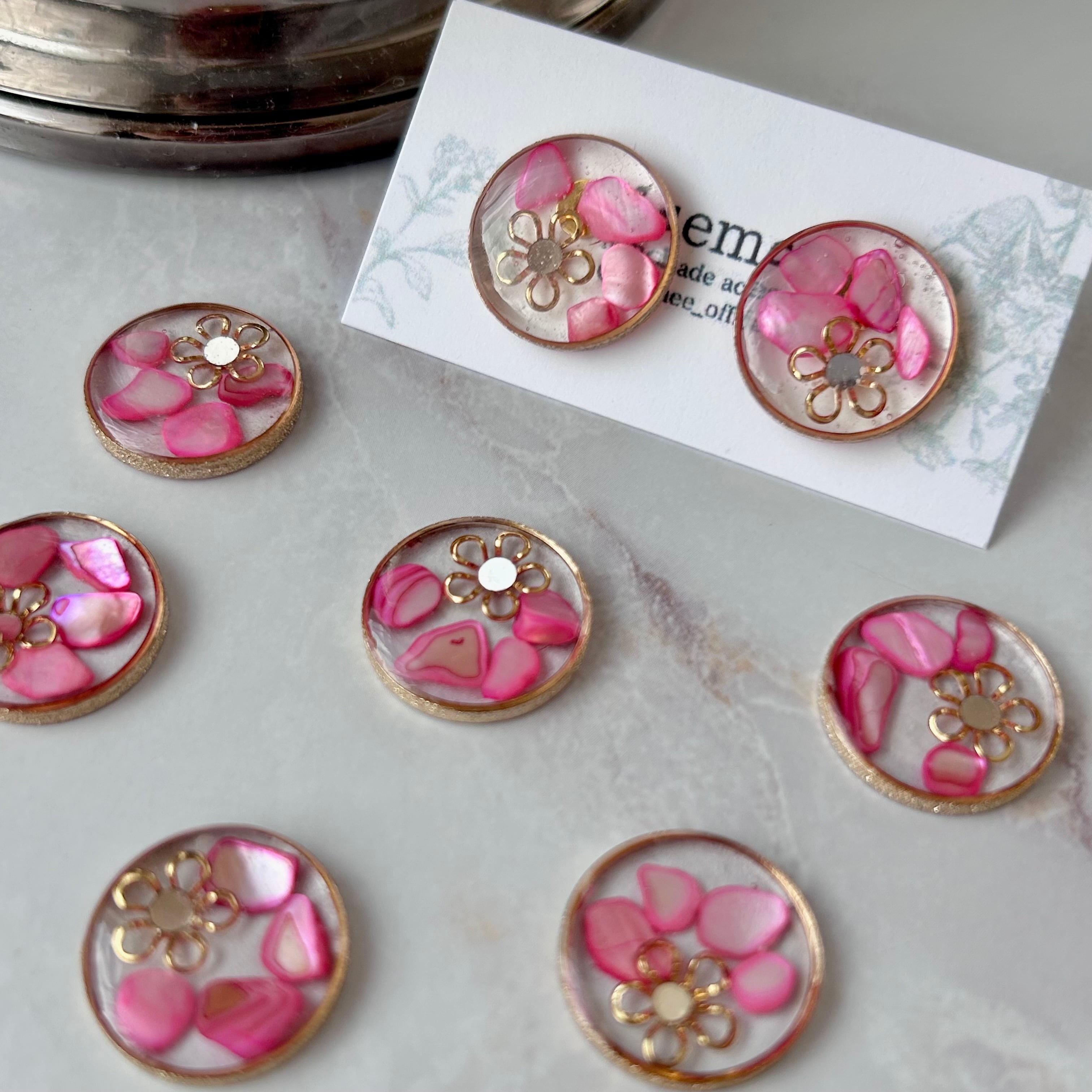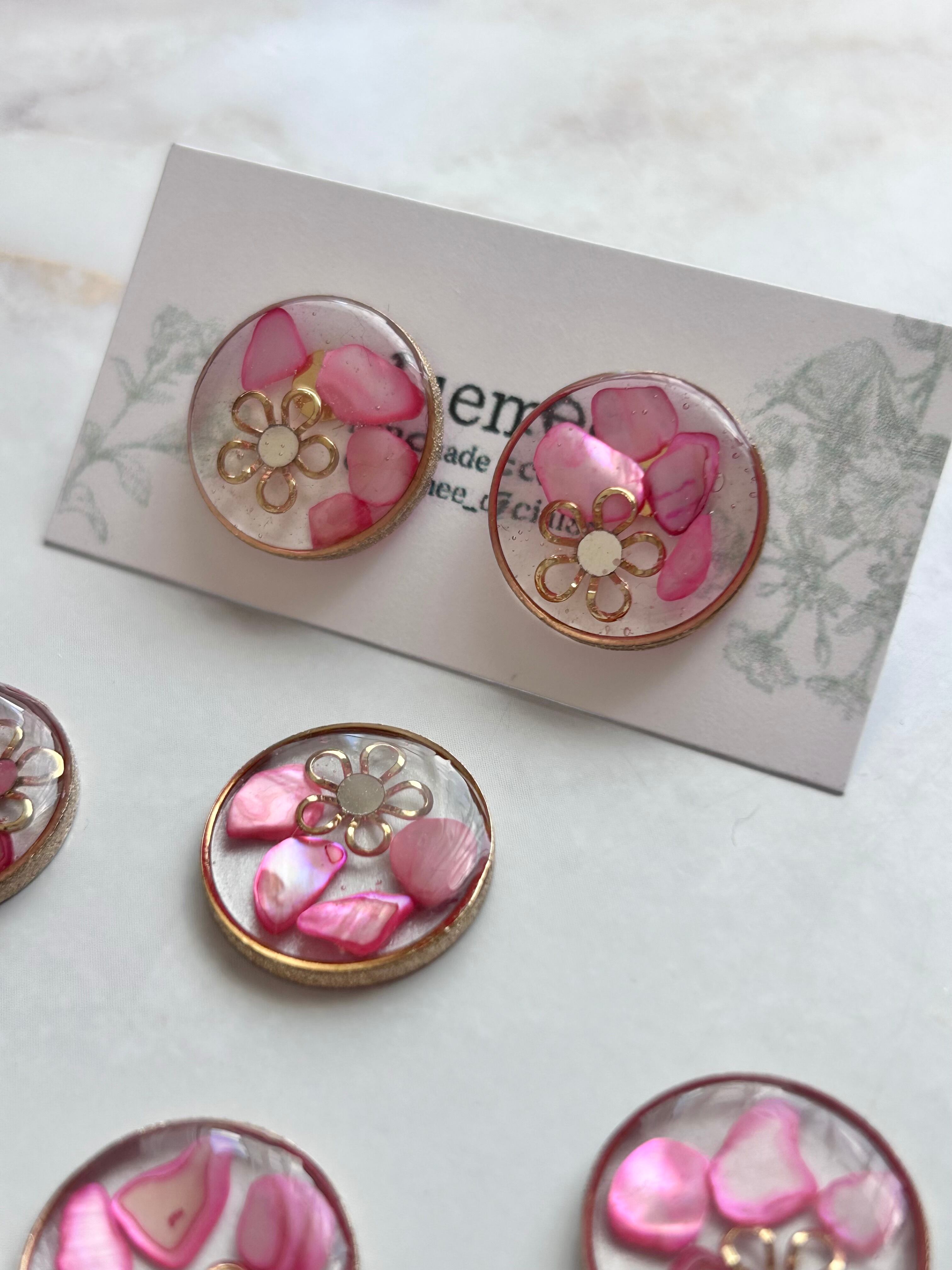 小花モチーフとピンクシェルを閉じ込めた、明るく華やぐピアス&イヤリング。