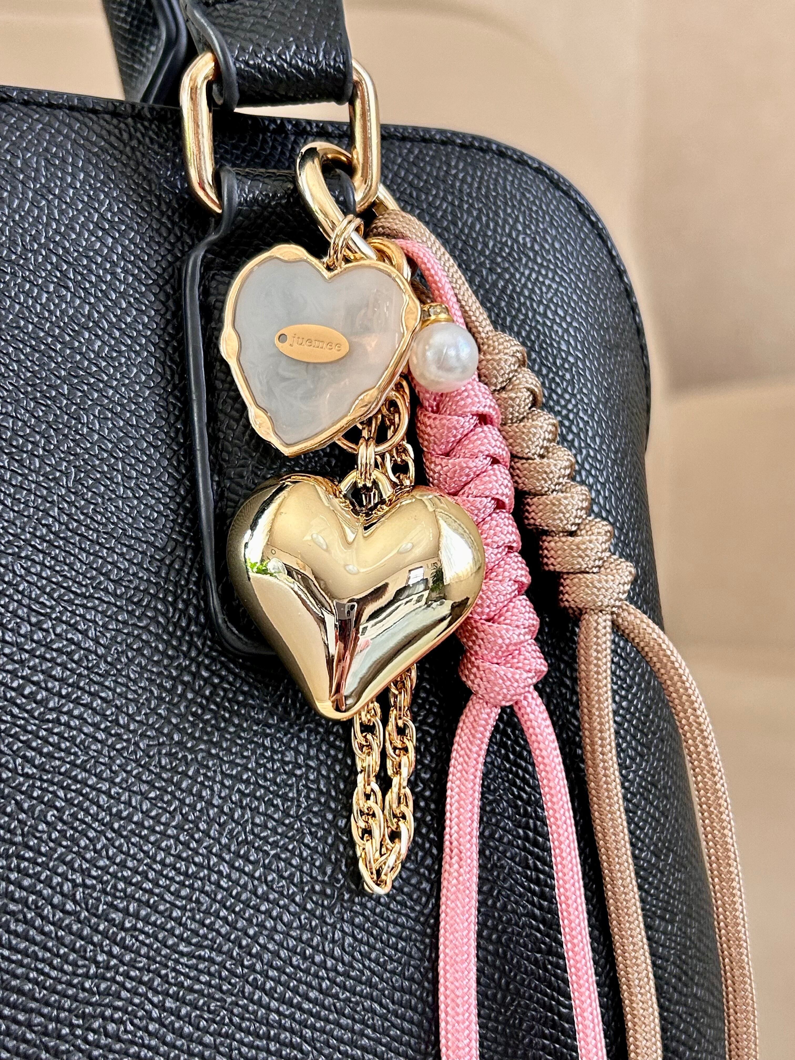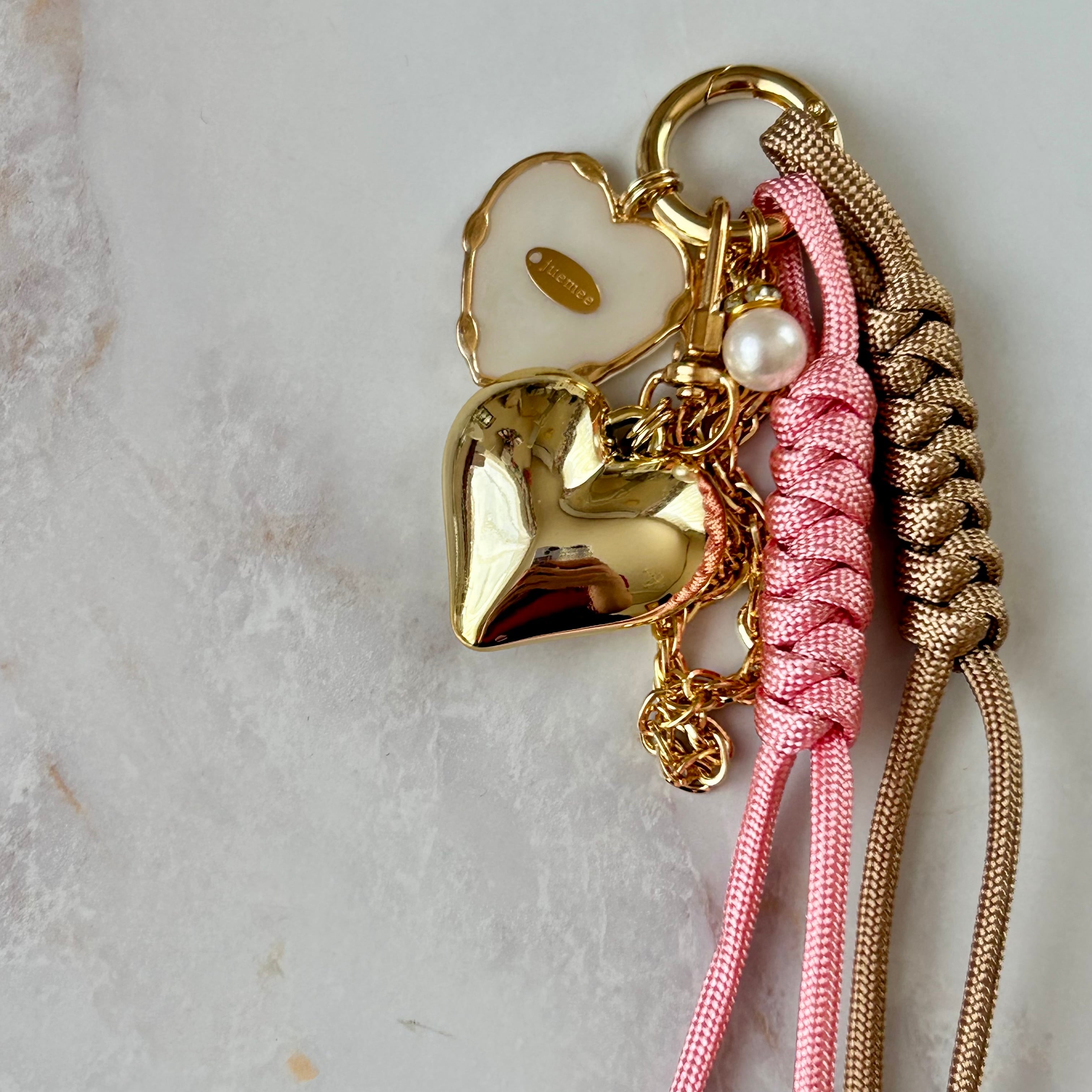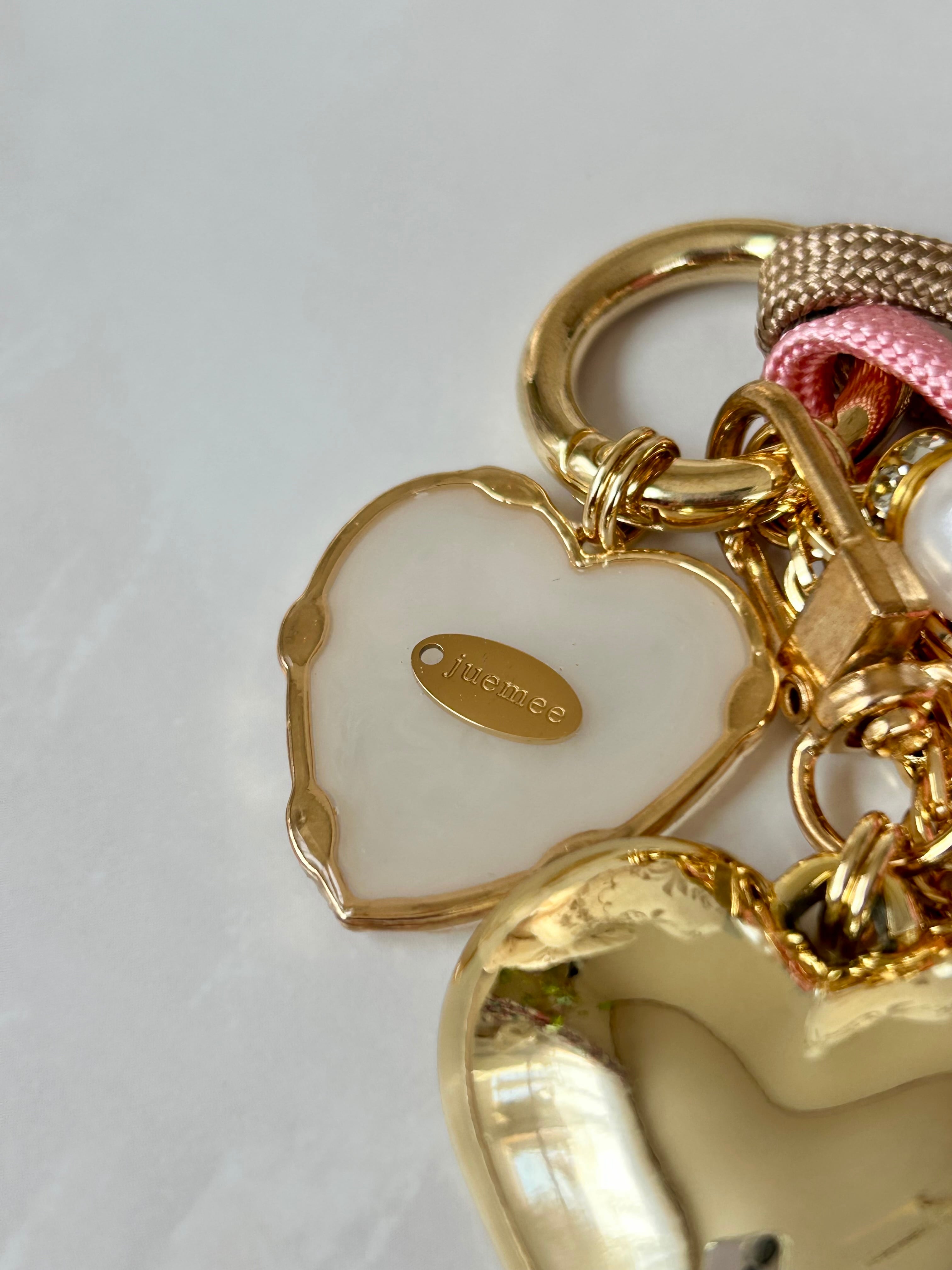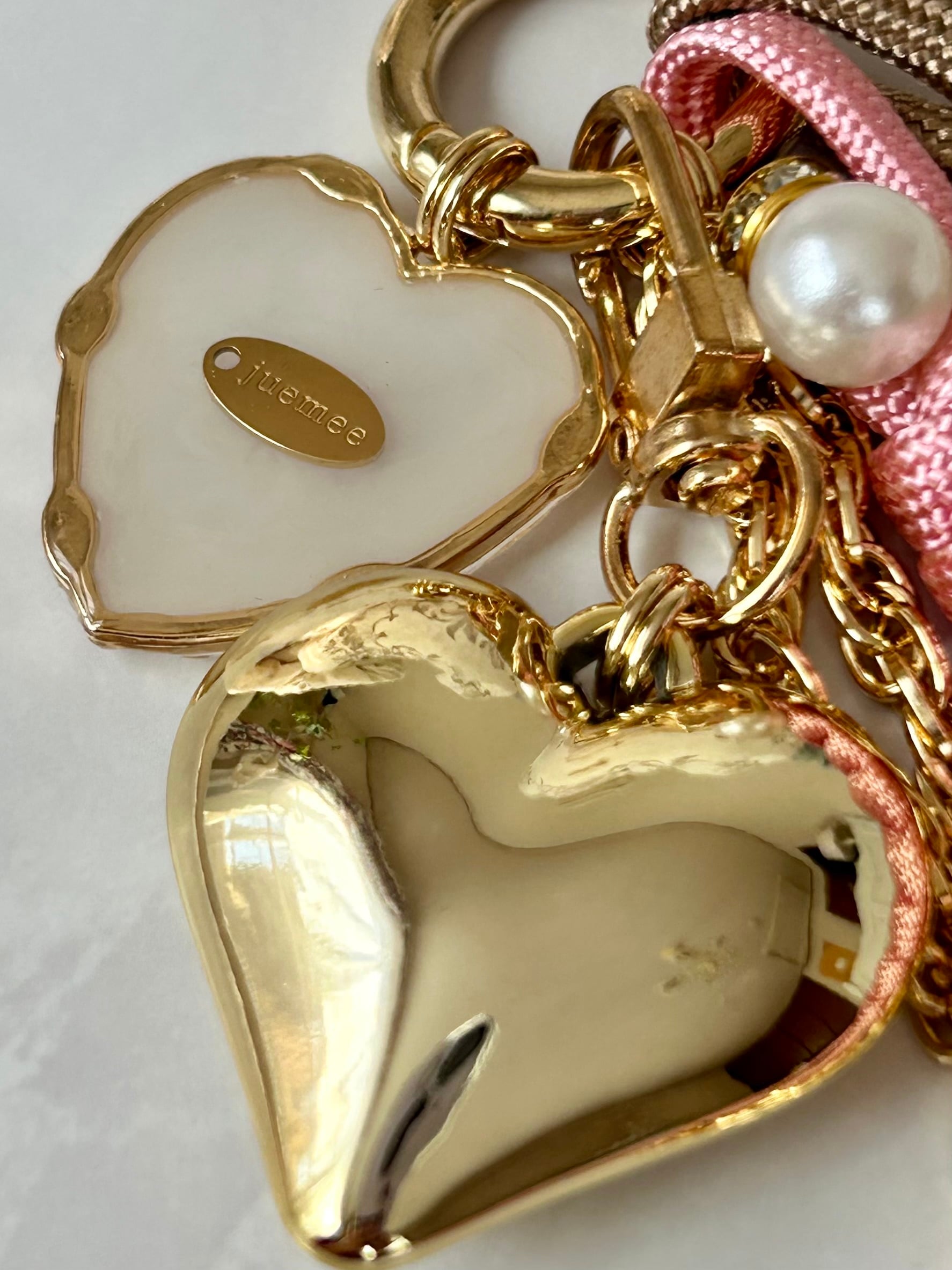 大きなゴールドのハートやパール、上品なチェーン、そしてカラビナタイプのキーリングを組み合わせ、ファッションの一部として楽しめる大人可愛いバッグチャームに。