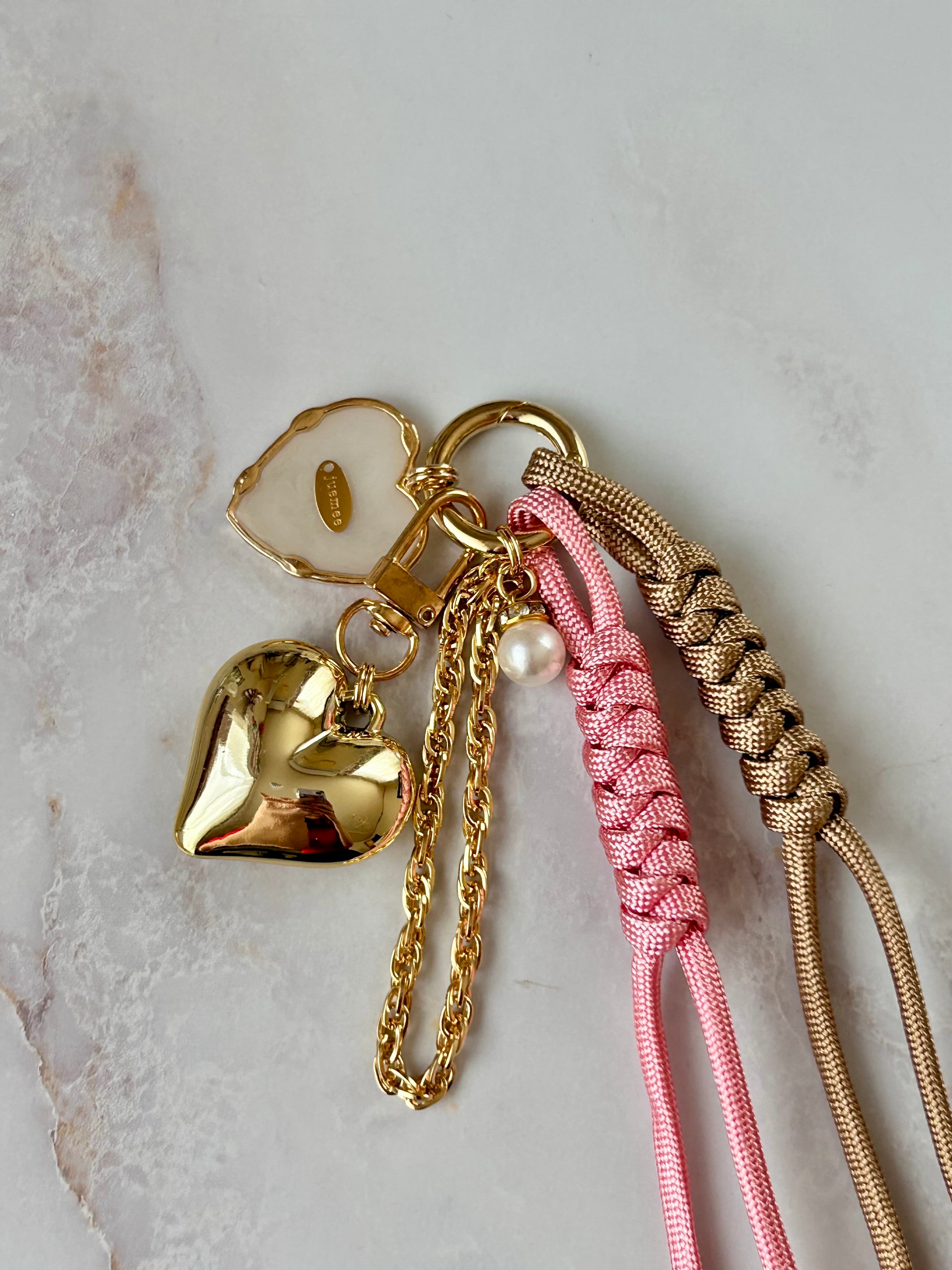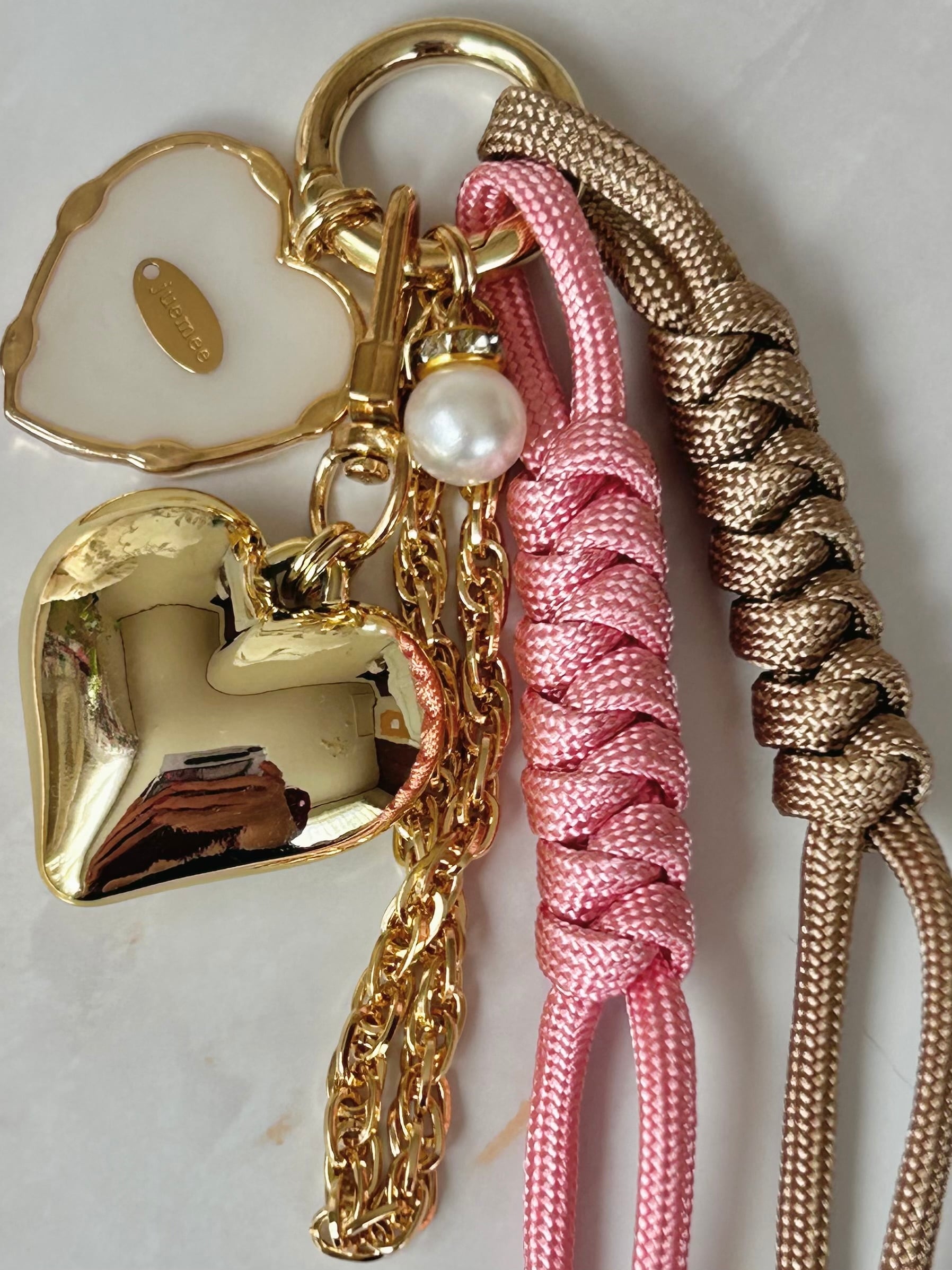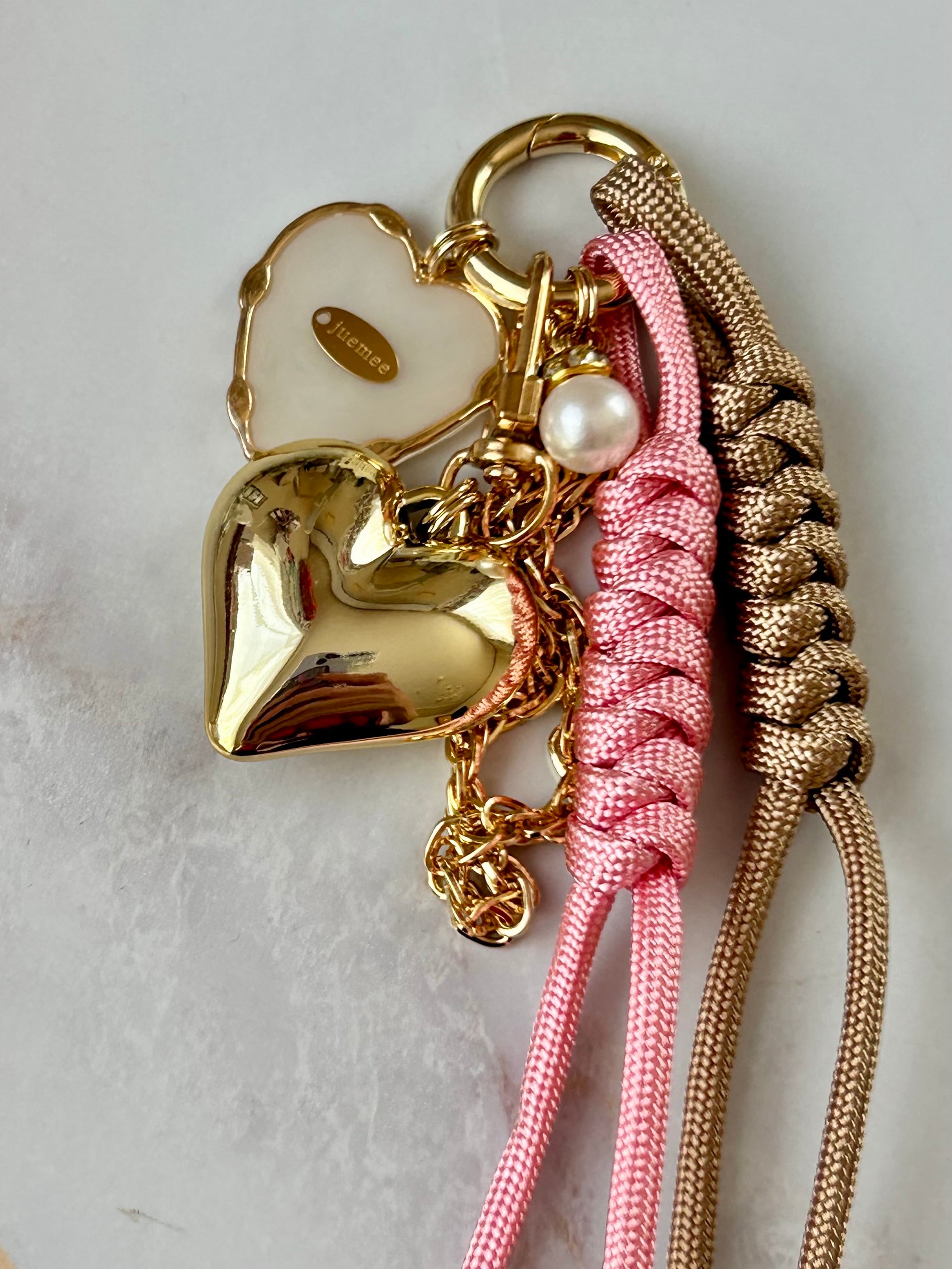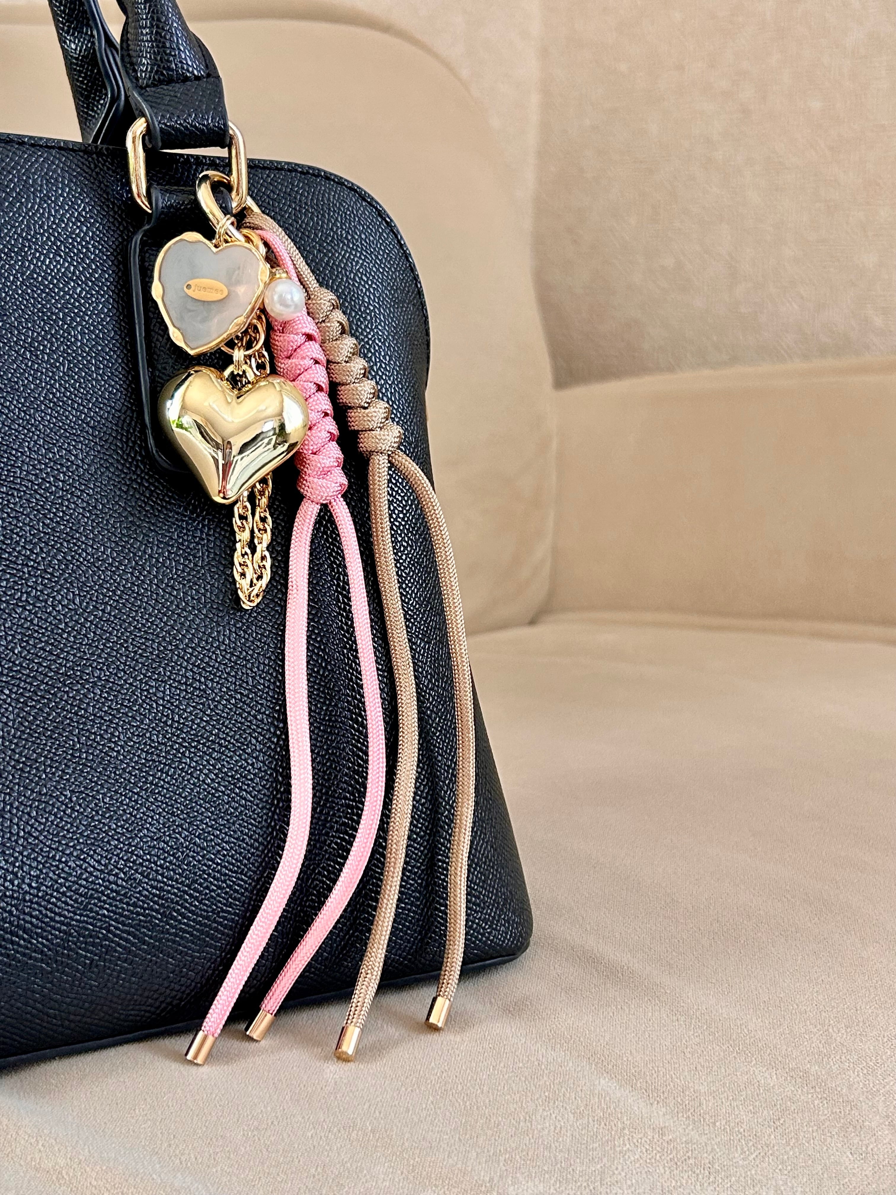 大きなゴールドのハートやパール、上品なチェーン、そしてカラビナタイプのキーリングを組み合わせ、ファッションの一部として楽しめる大人可愛いバッグチャームに。