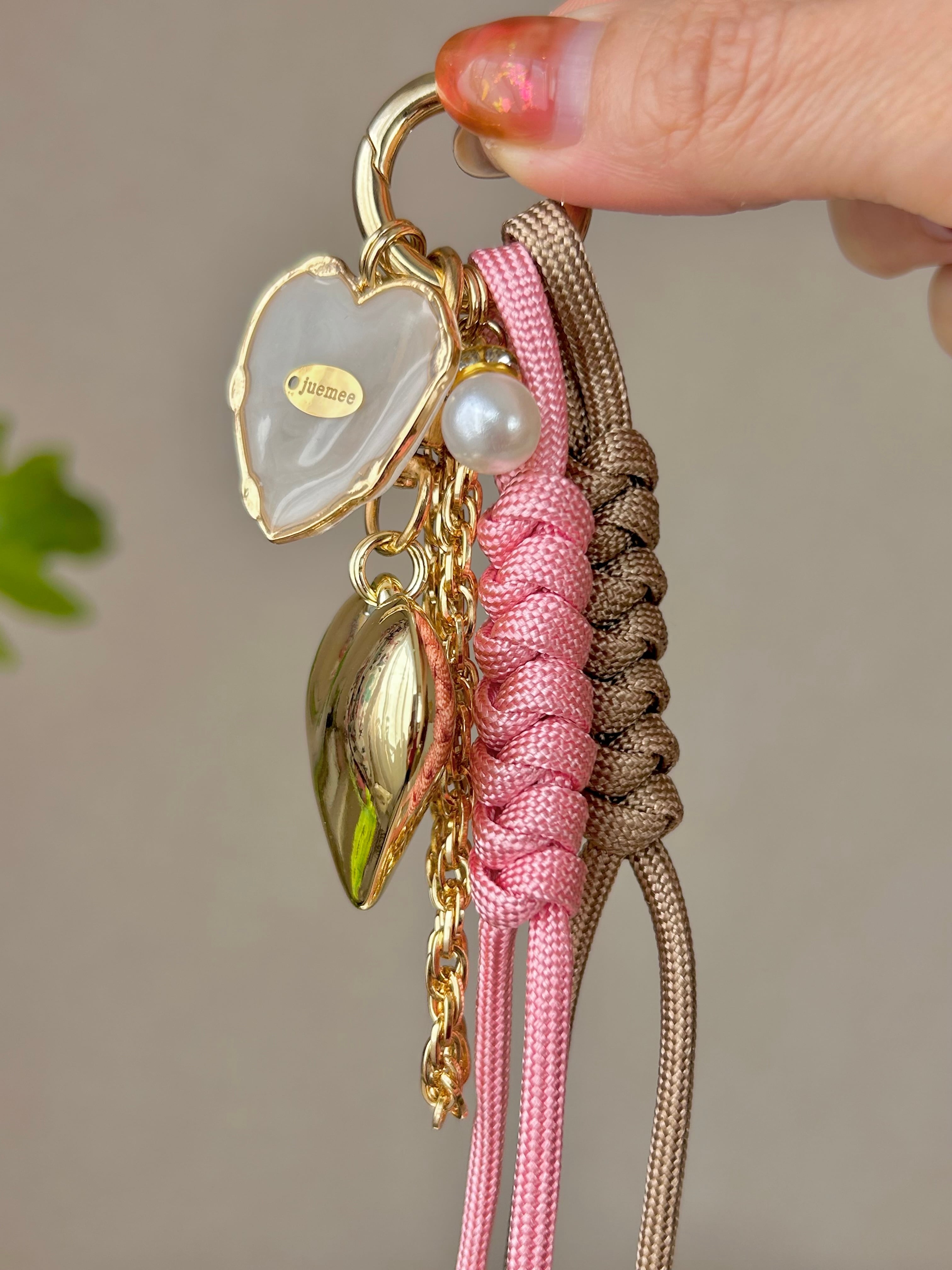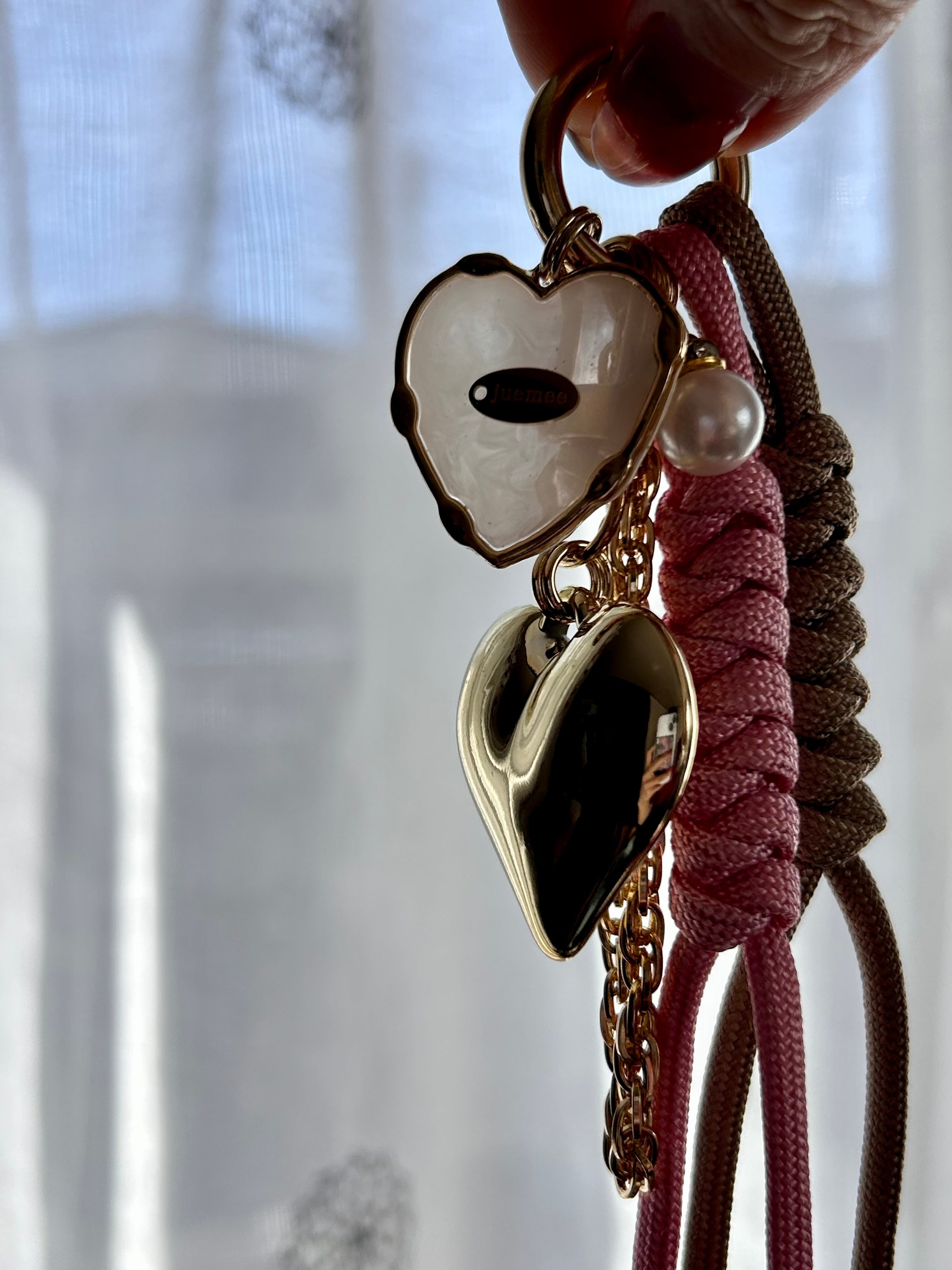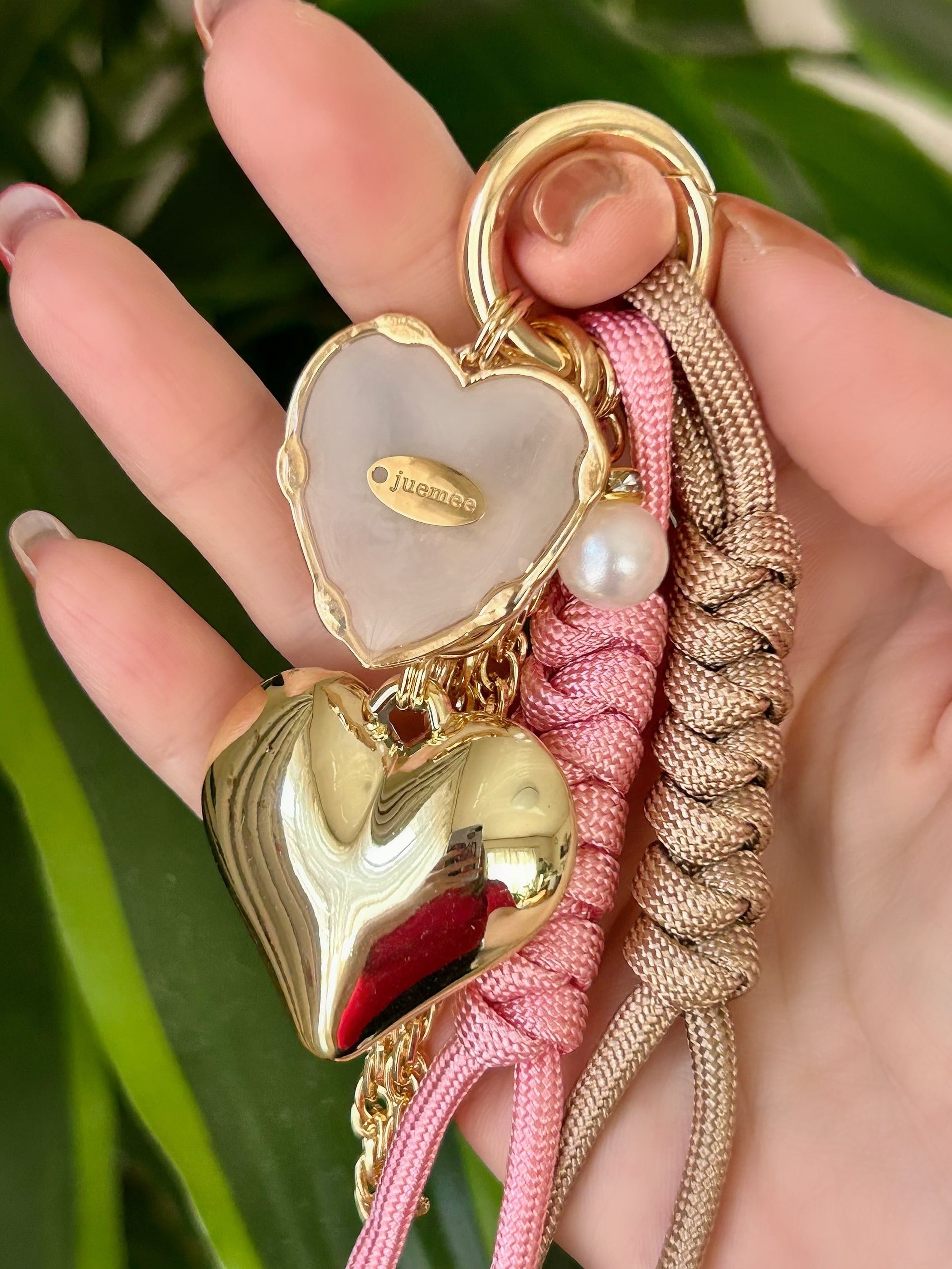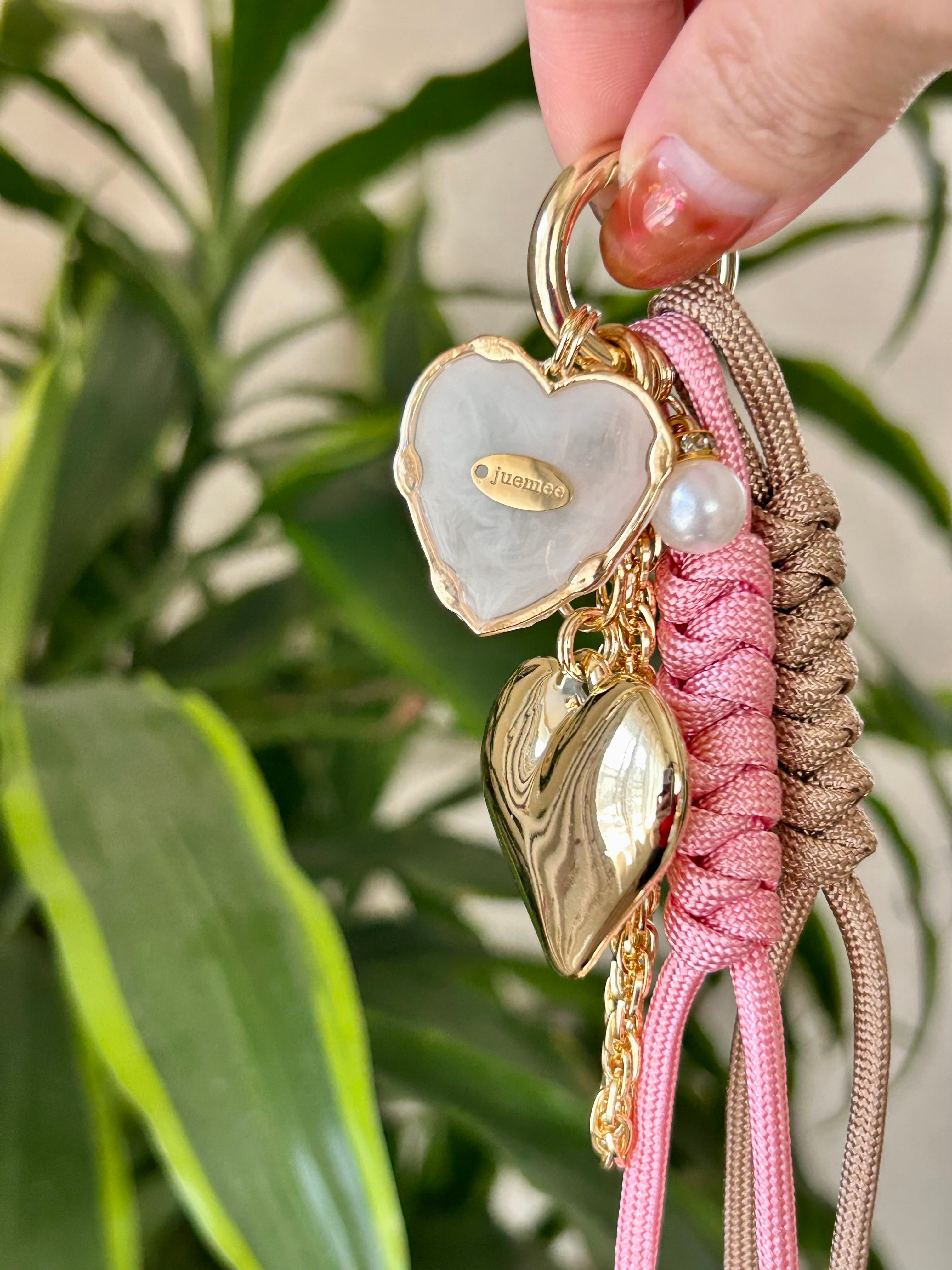 大きなゴールドのハートやパール、上品なチェーン、そしてカラビナタイプのキーリングを組み合わせ、ファッションの一部として楽しめる大人可愛いバッグチャームに。