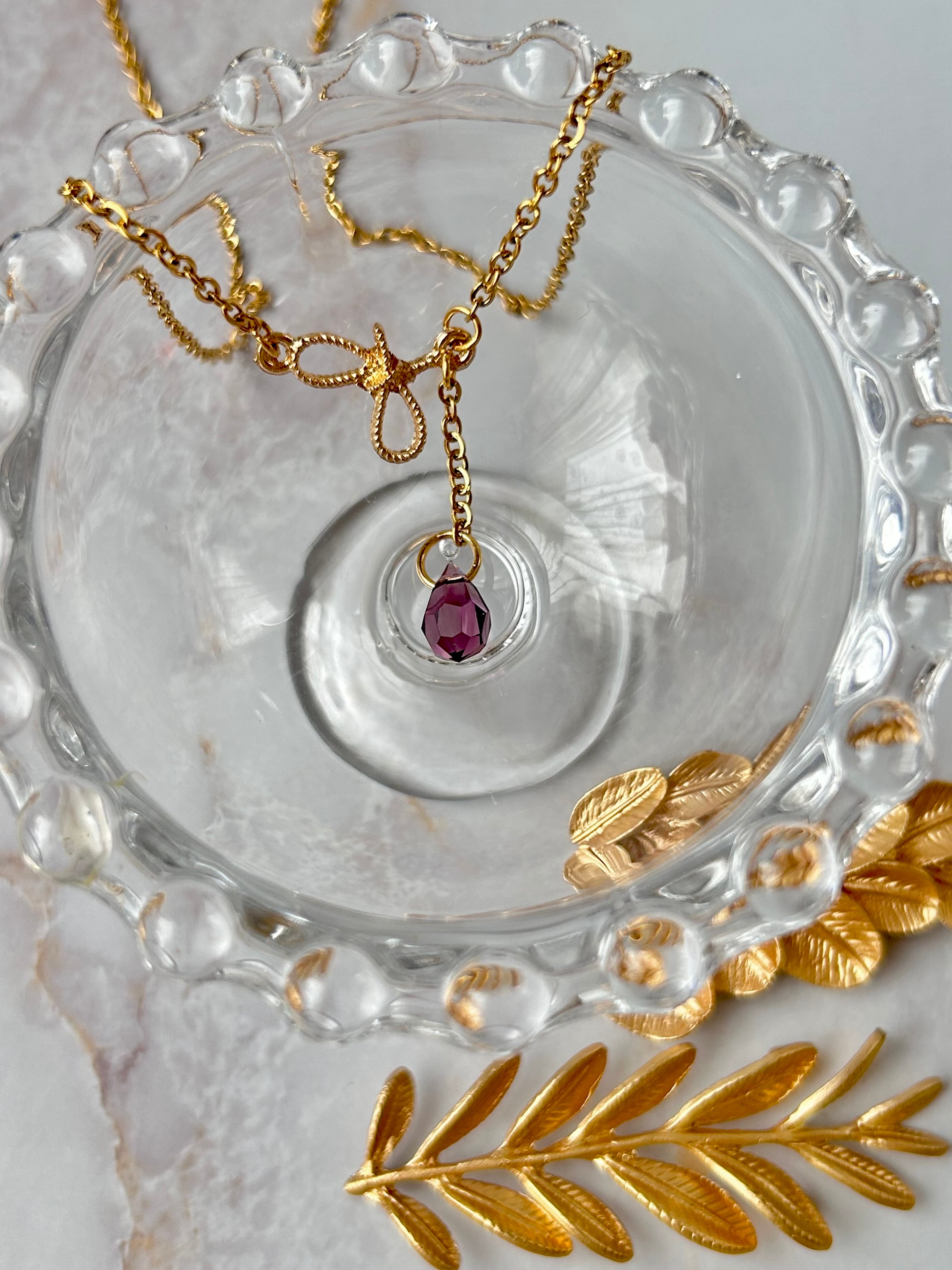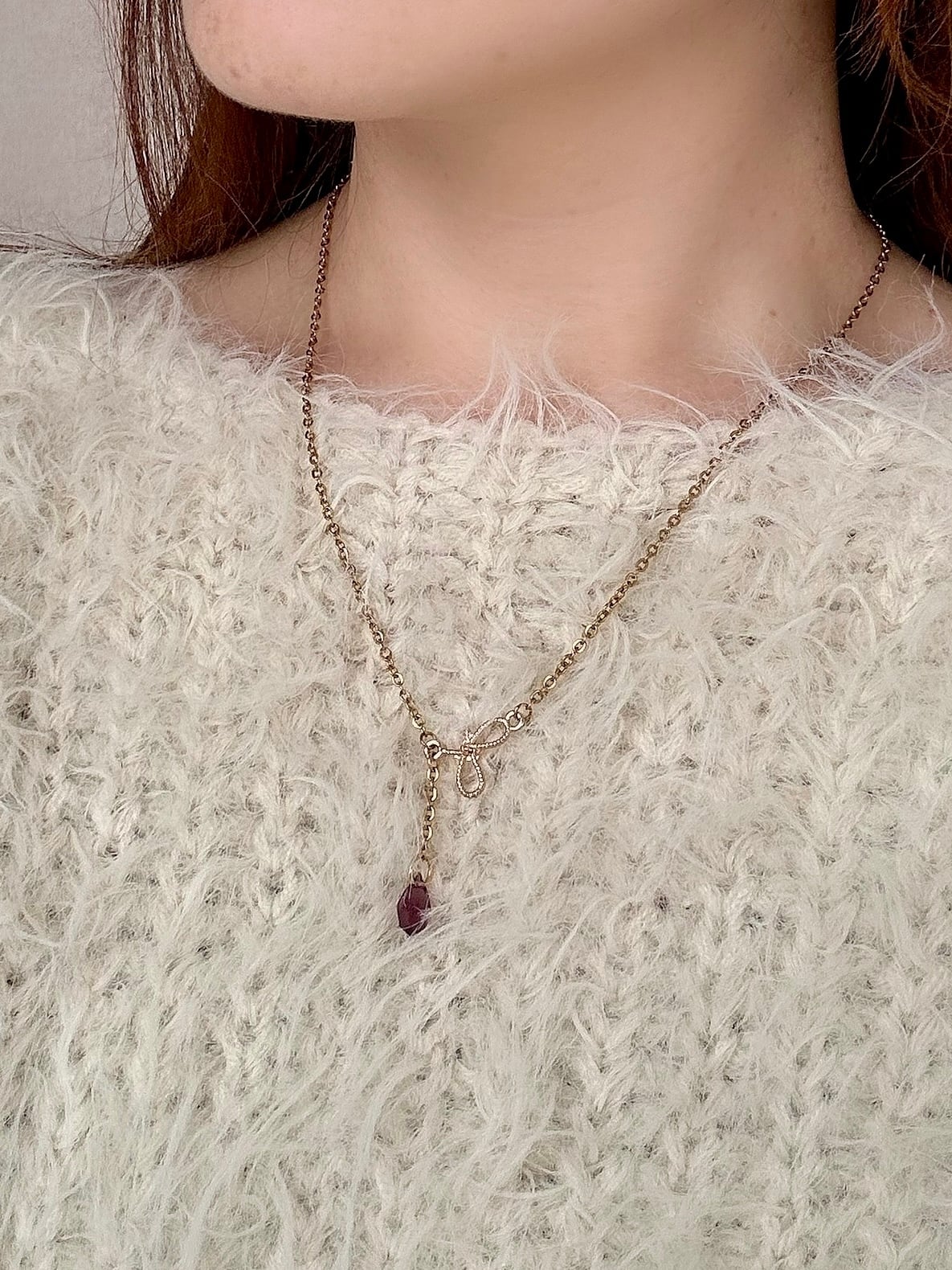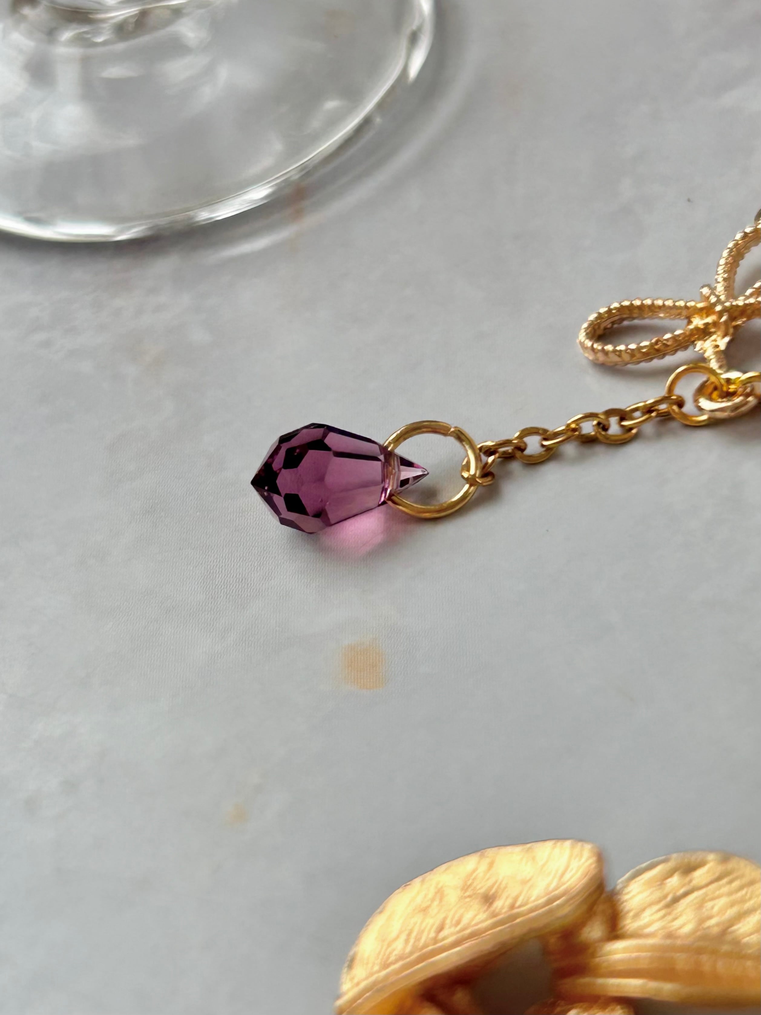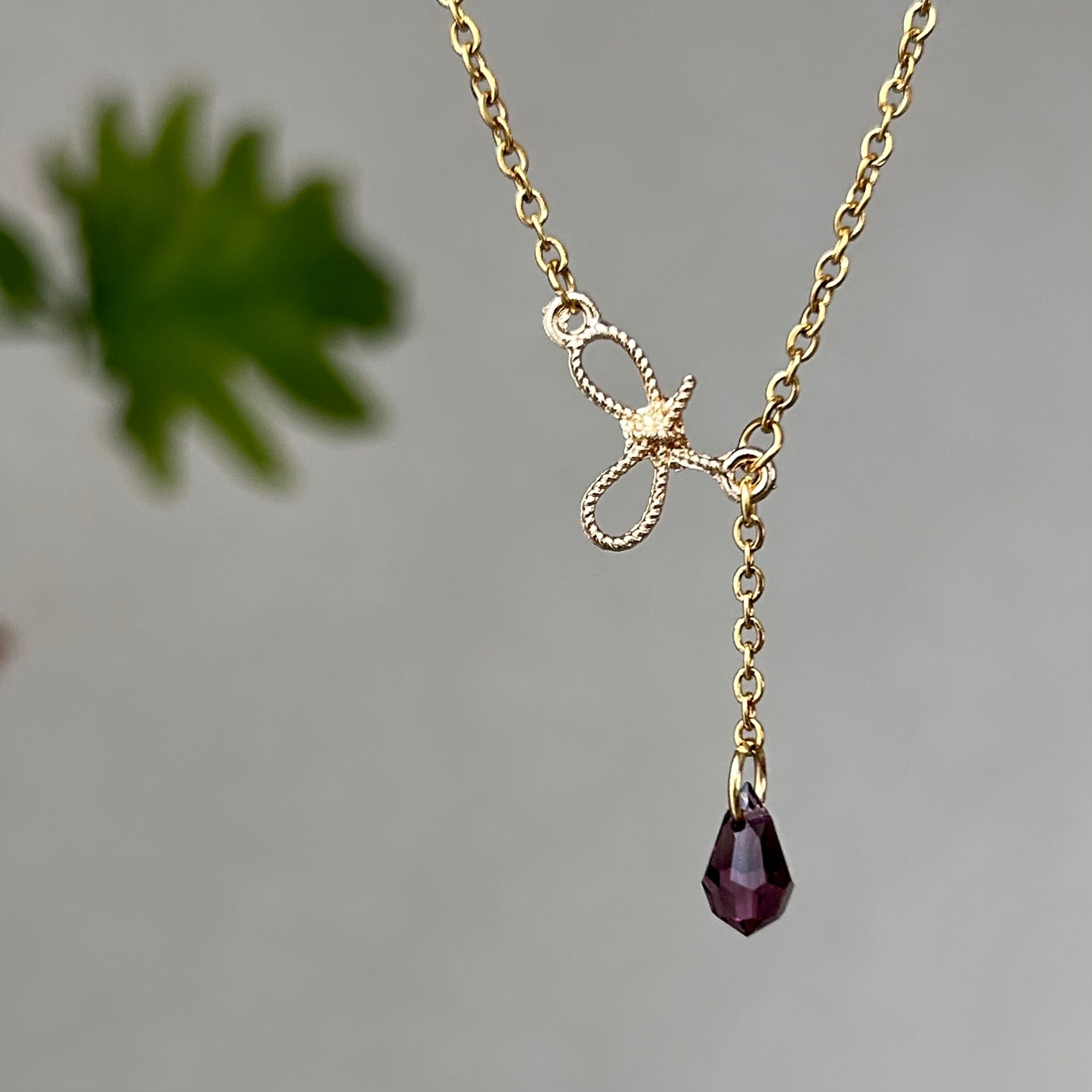 女性らしい可愛さのリボンチャームに、雫型のクリスタルがワンポイントのネックレスです❤︎