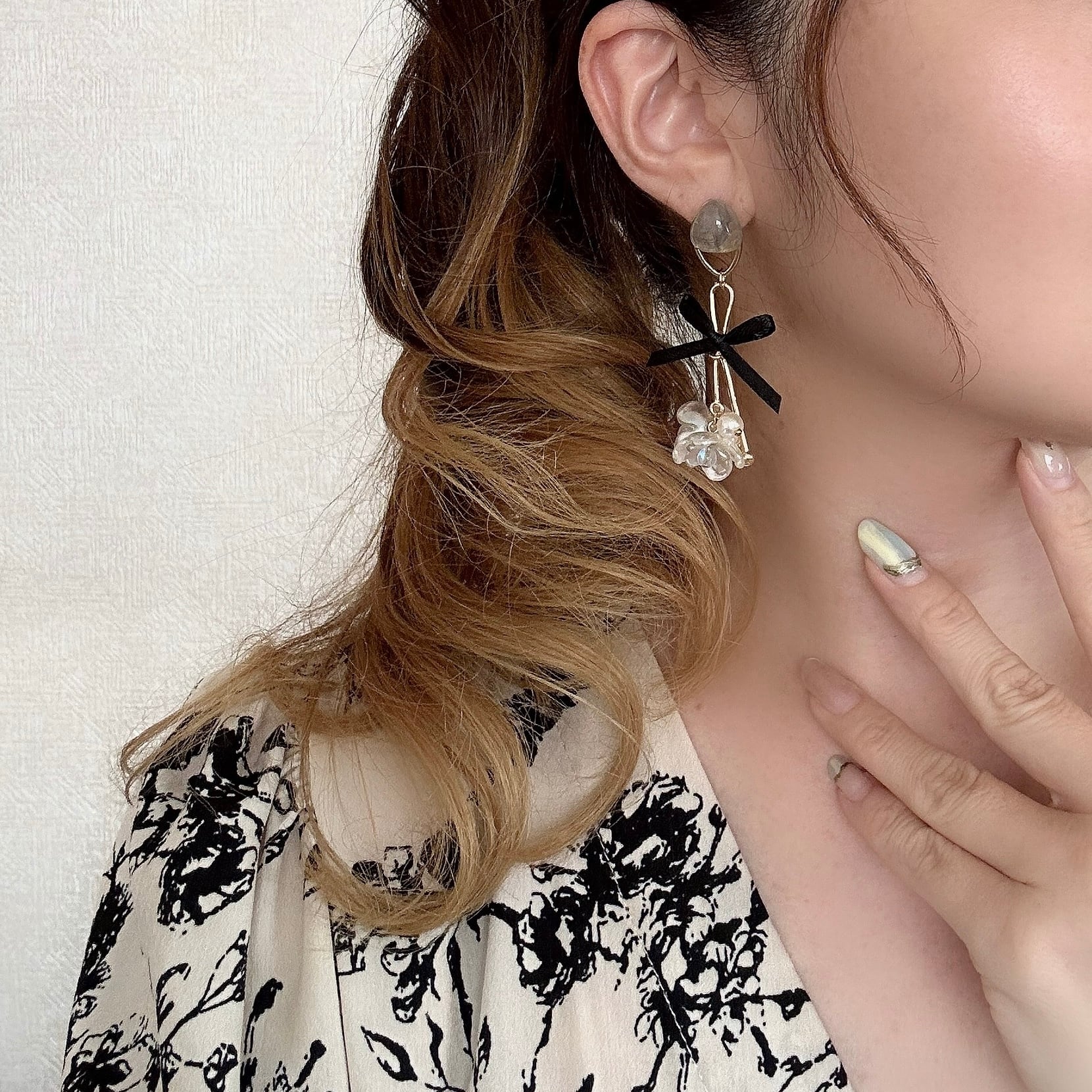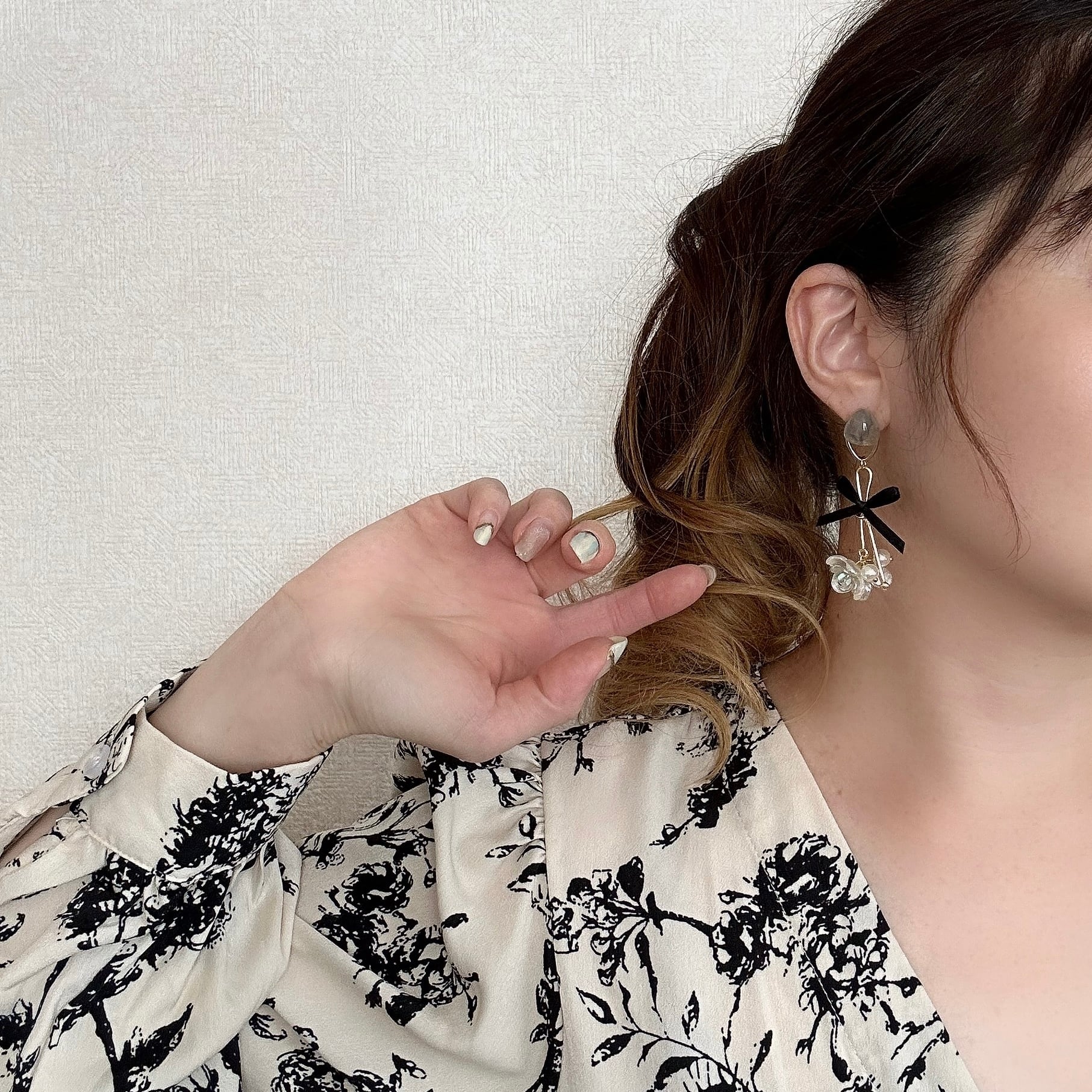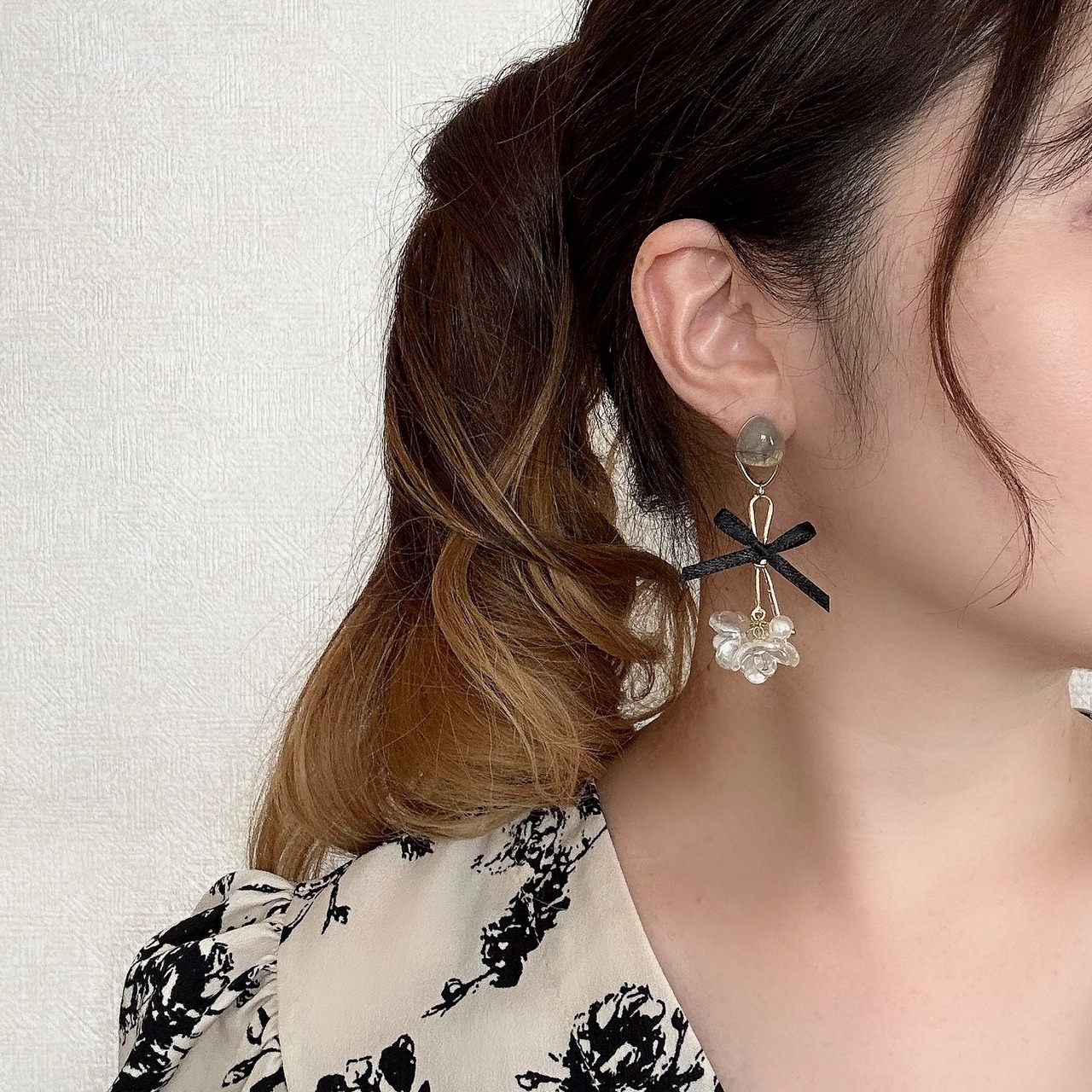 華奢なブラックリボンが耳元で軽やかに揺れ、大人可愛い印象を添えます。