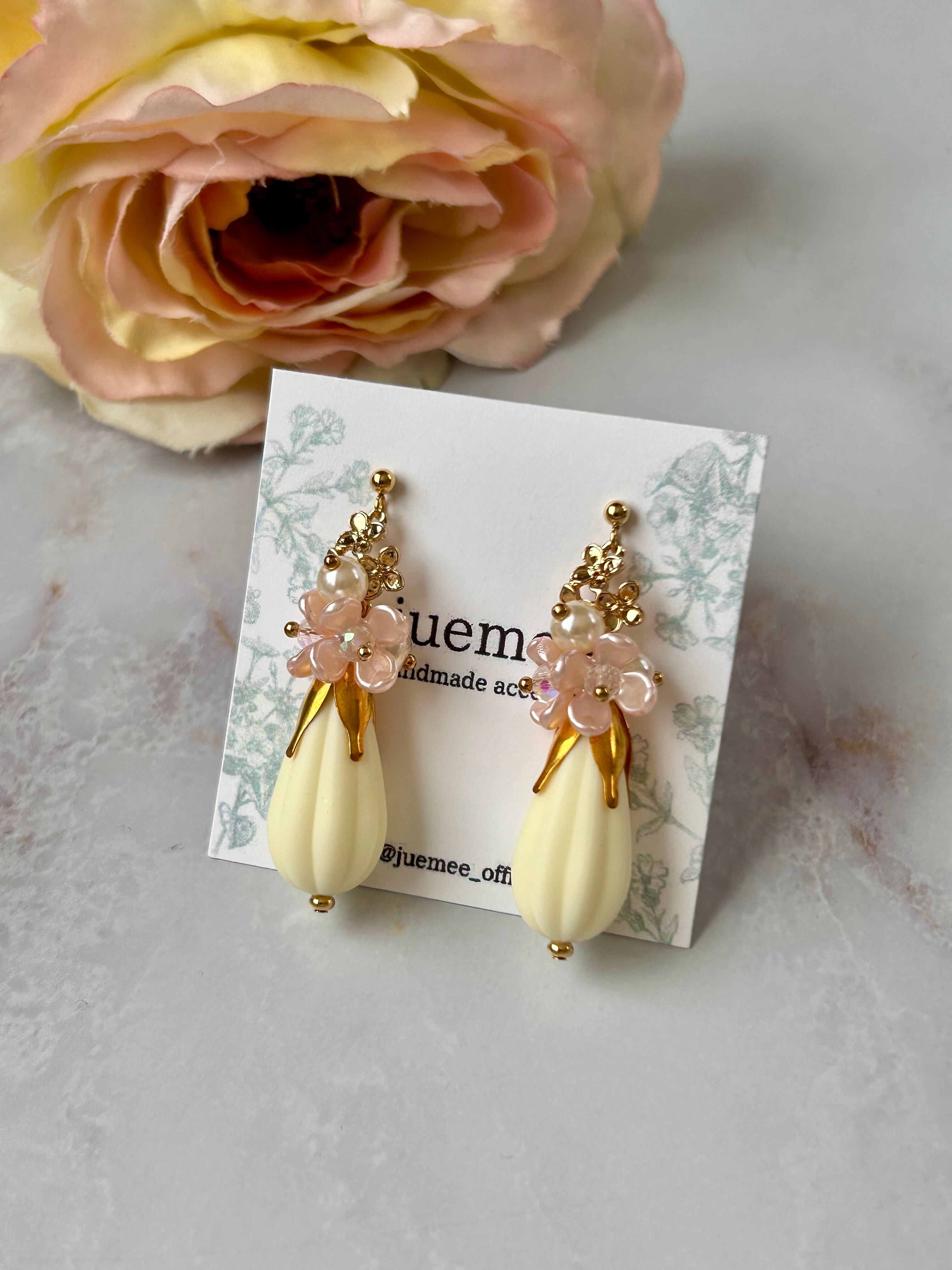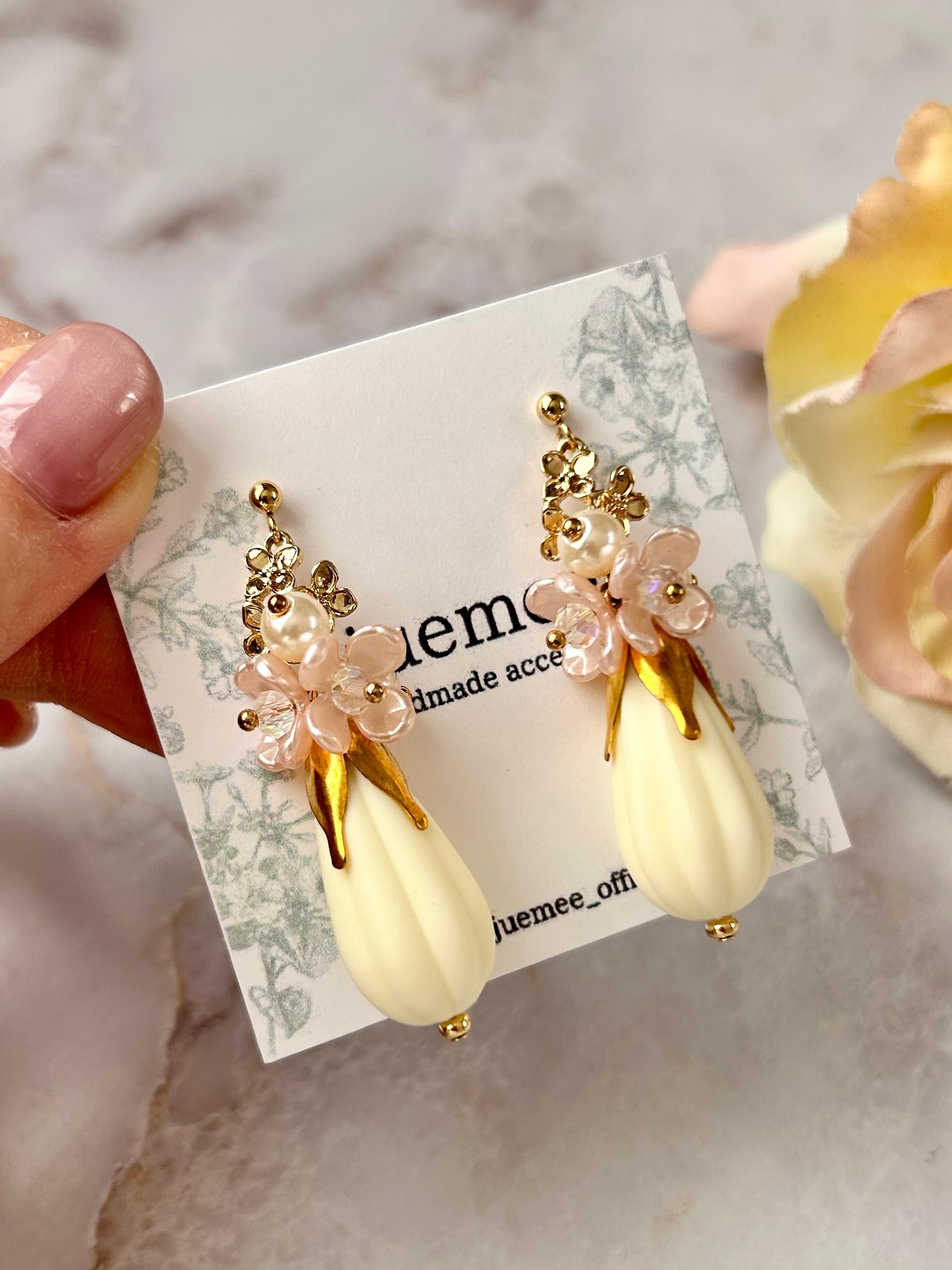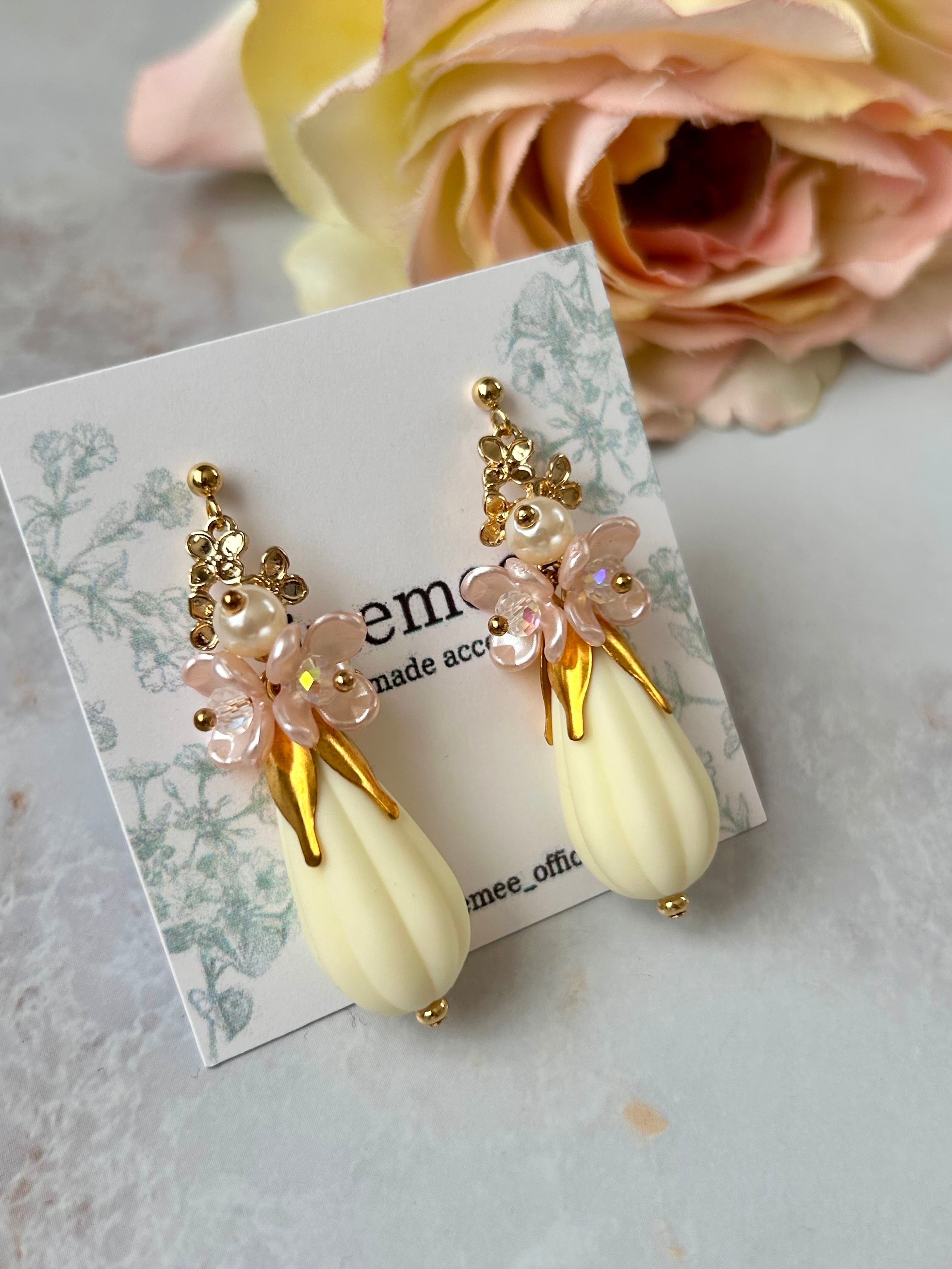 ミルク色のドロップビーズと小さなピンクのお花が耳元で揺れ、可愛さと上品さを兼ね備えていますよ♡