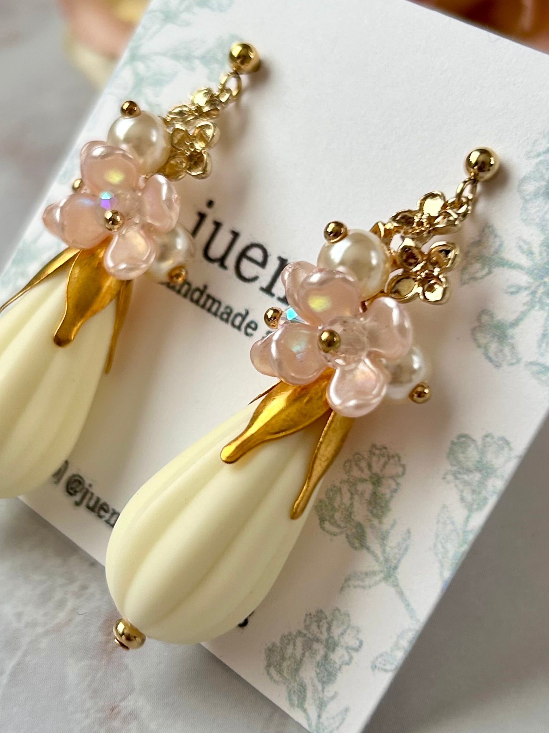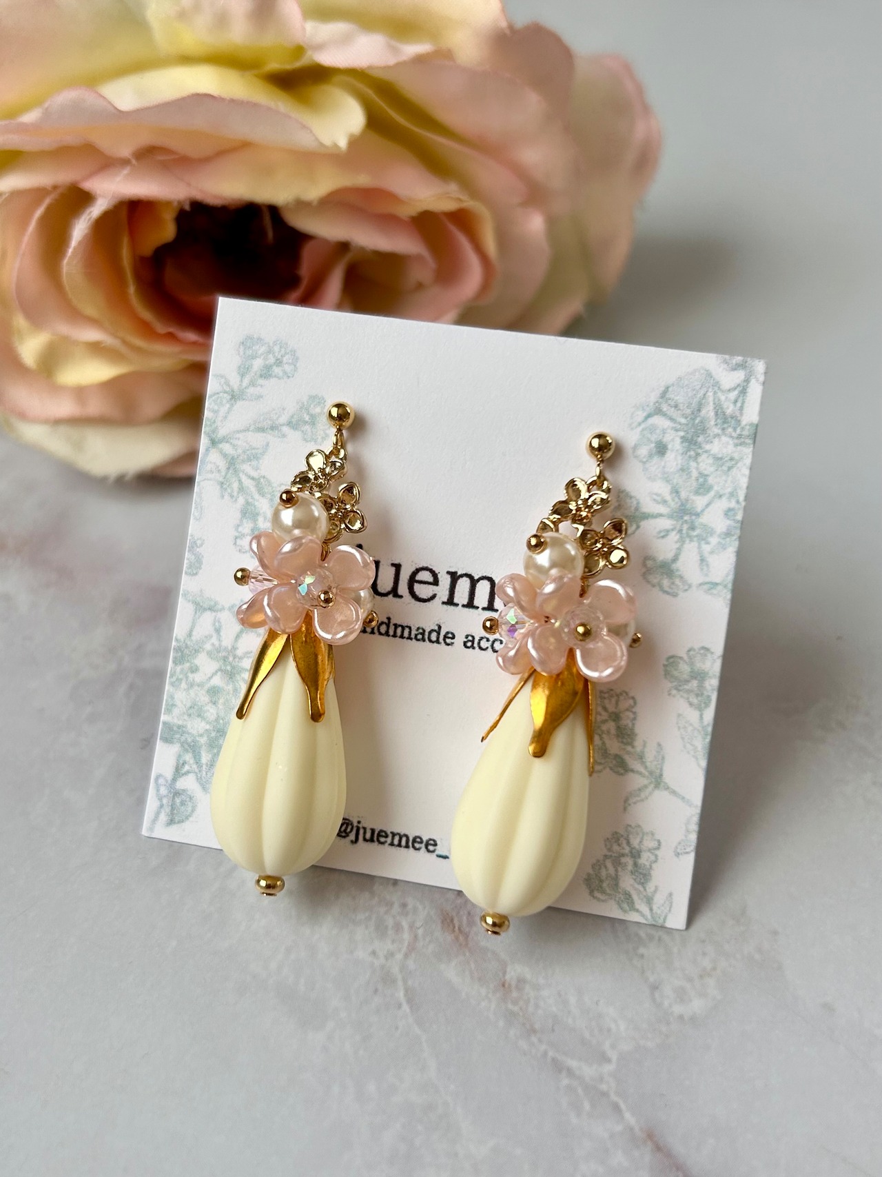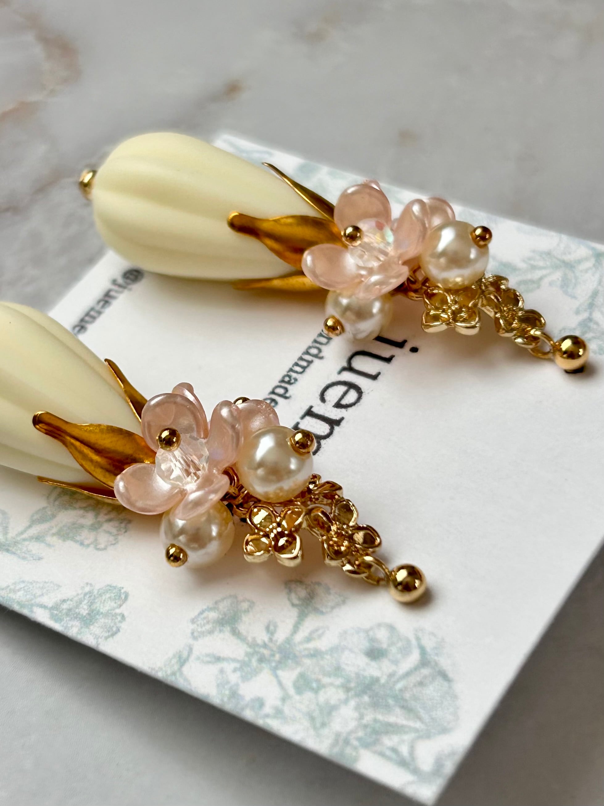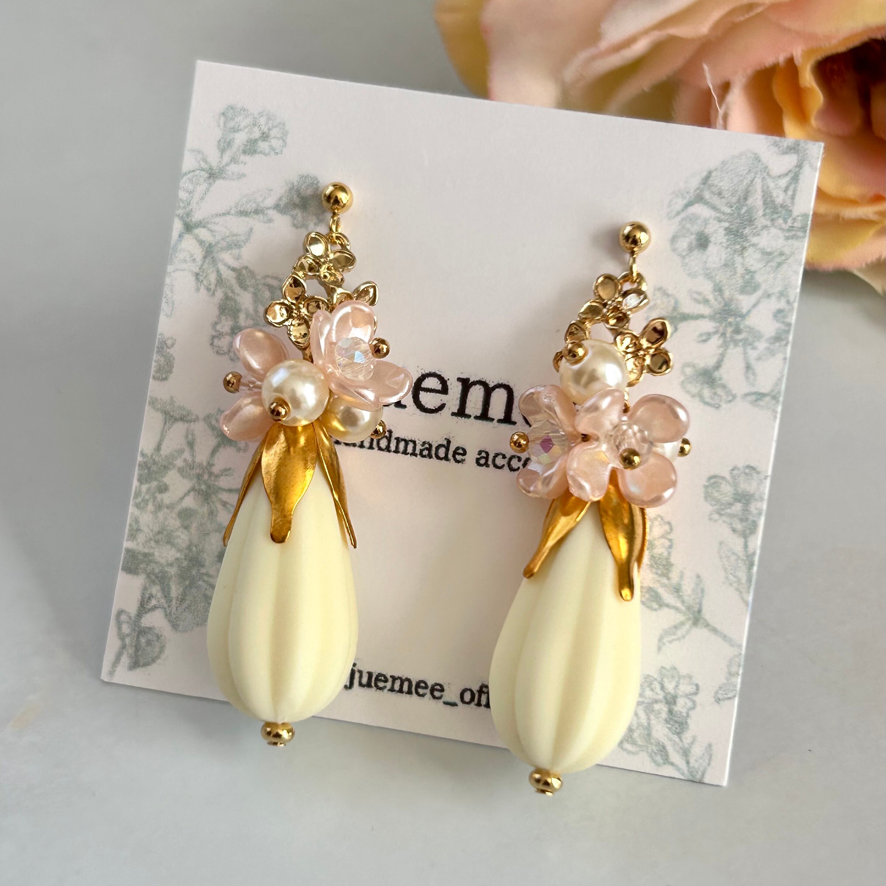 ミルク色のドロップビーズと小さなピンクのお花が耳元で揺れ、可愛さと上品さを兼ね備えていますよ♡